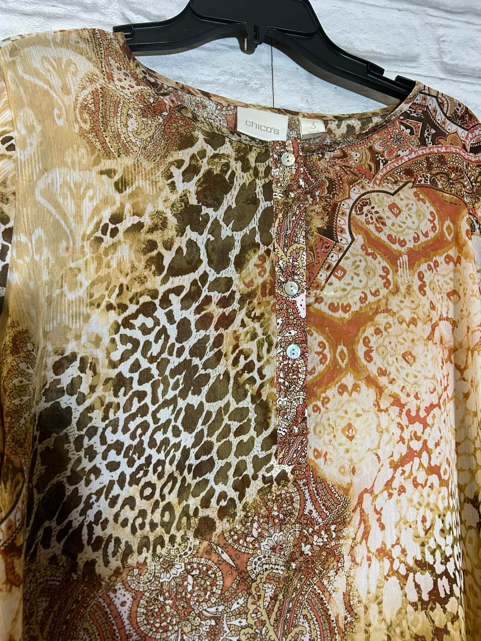Chico's Size 3 light weight poly blouse w/ button detail, tab sleeves. Animal and multi print. New with tags!