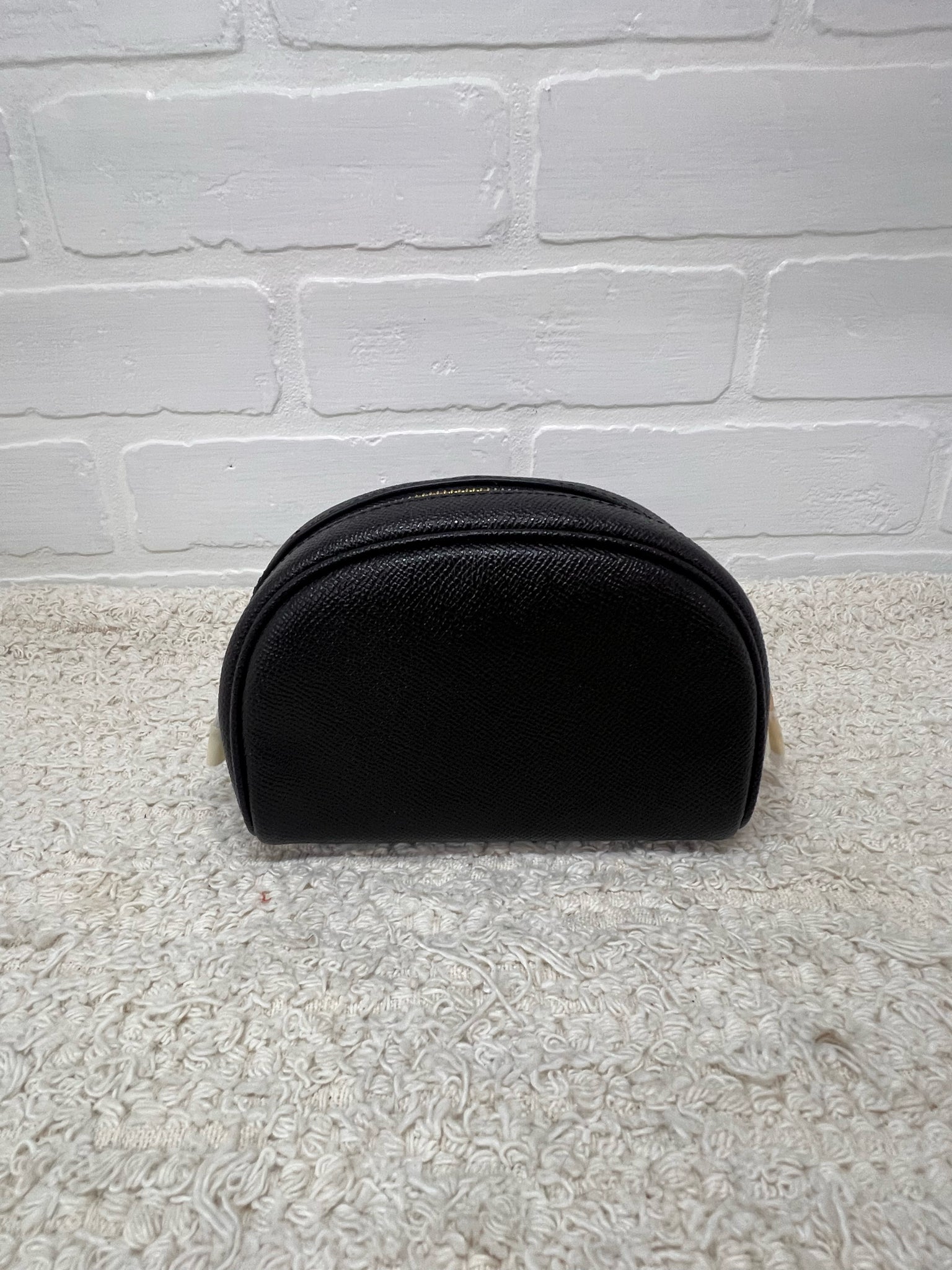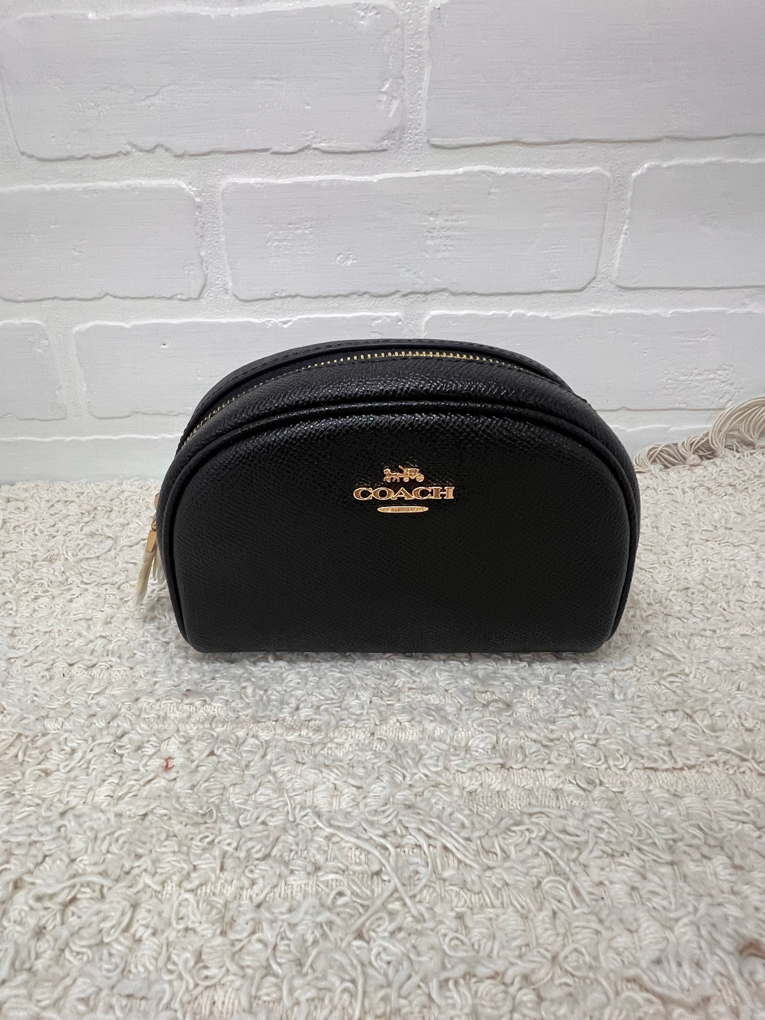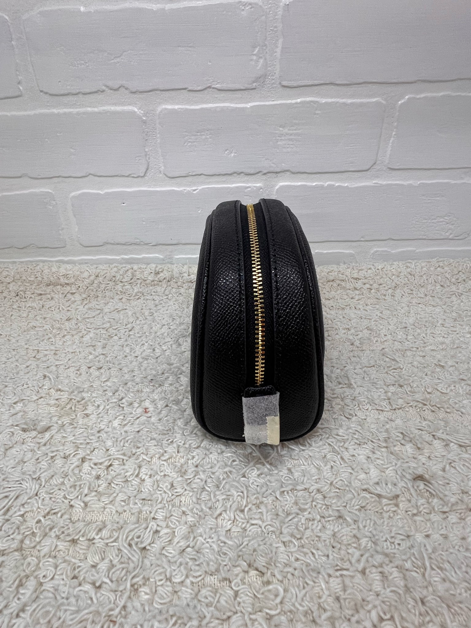 Black pebbled leather domed top cosmetic case from Coach. Goldtone zipper, zippers still wrapped as case is unused! Fabric lining. Measures approx 6"x 2.5" x 4" tall. Retailed for $118