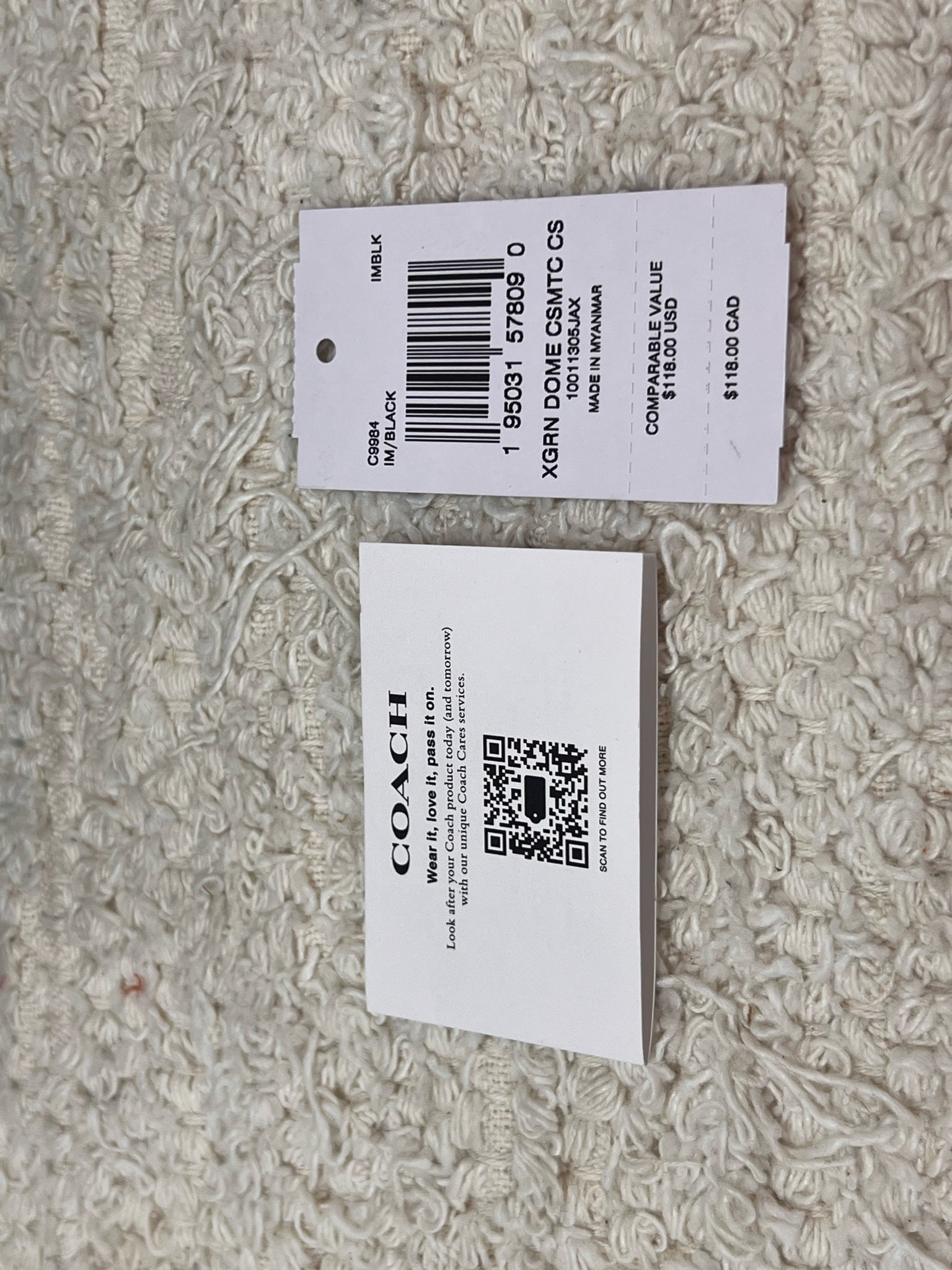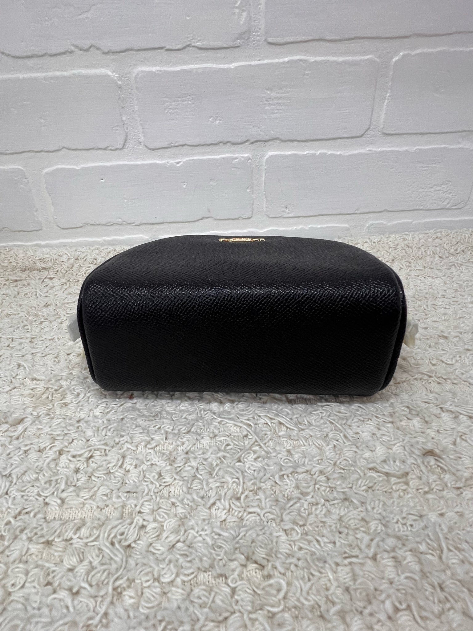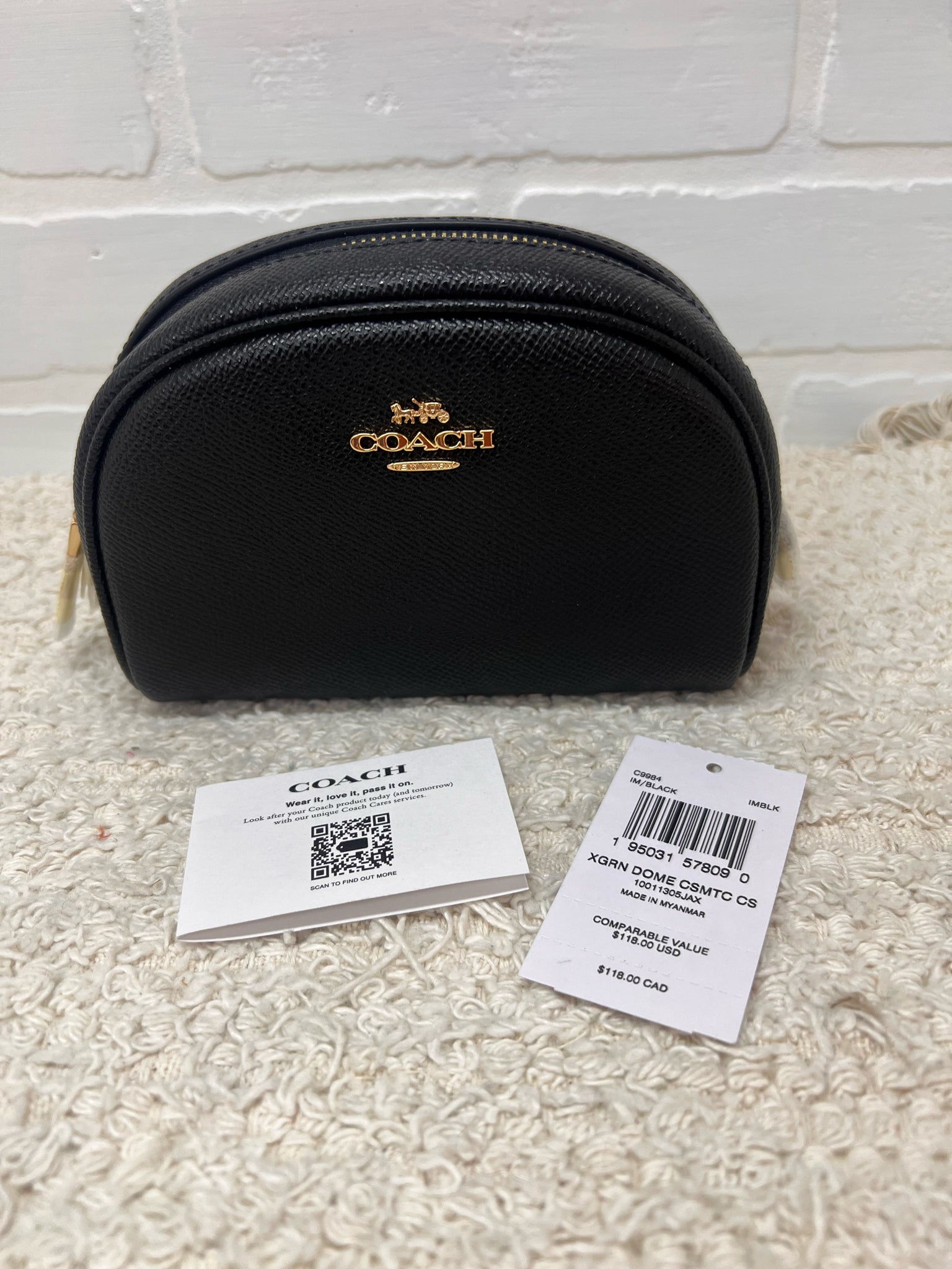 Black pebbled leather domed top cosmetic case from Coach. Goldtone zipper, zippers still wrapped as case is unused! Fabric lining. Measures approx 6"x 2.5" x 4" tall. Retailed for $118