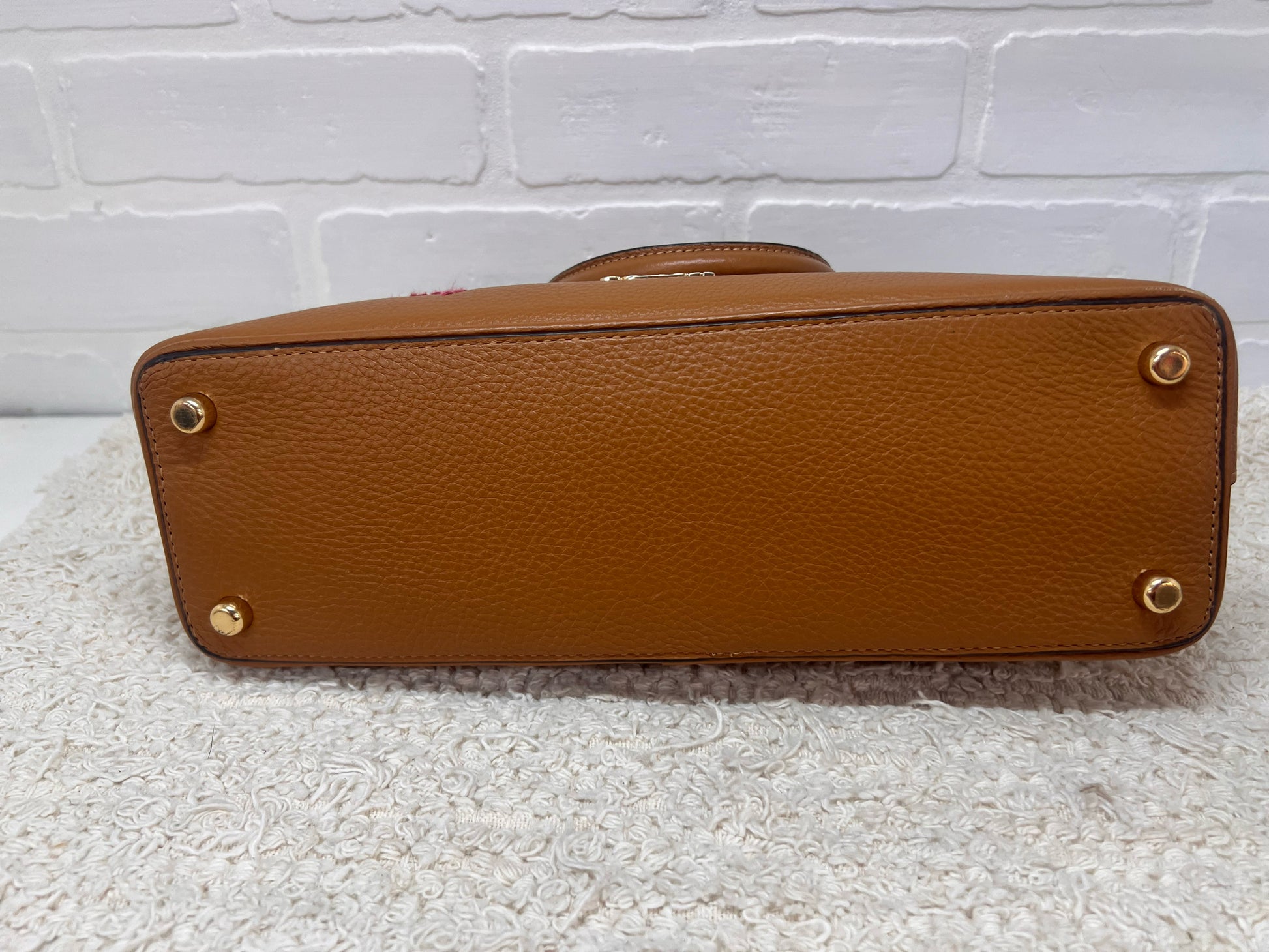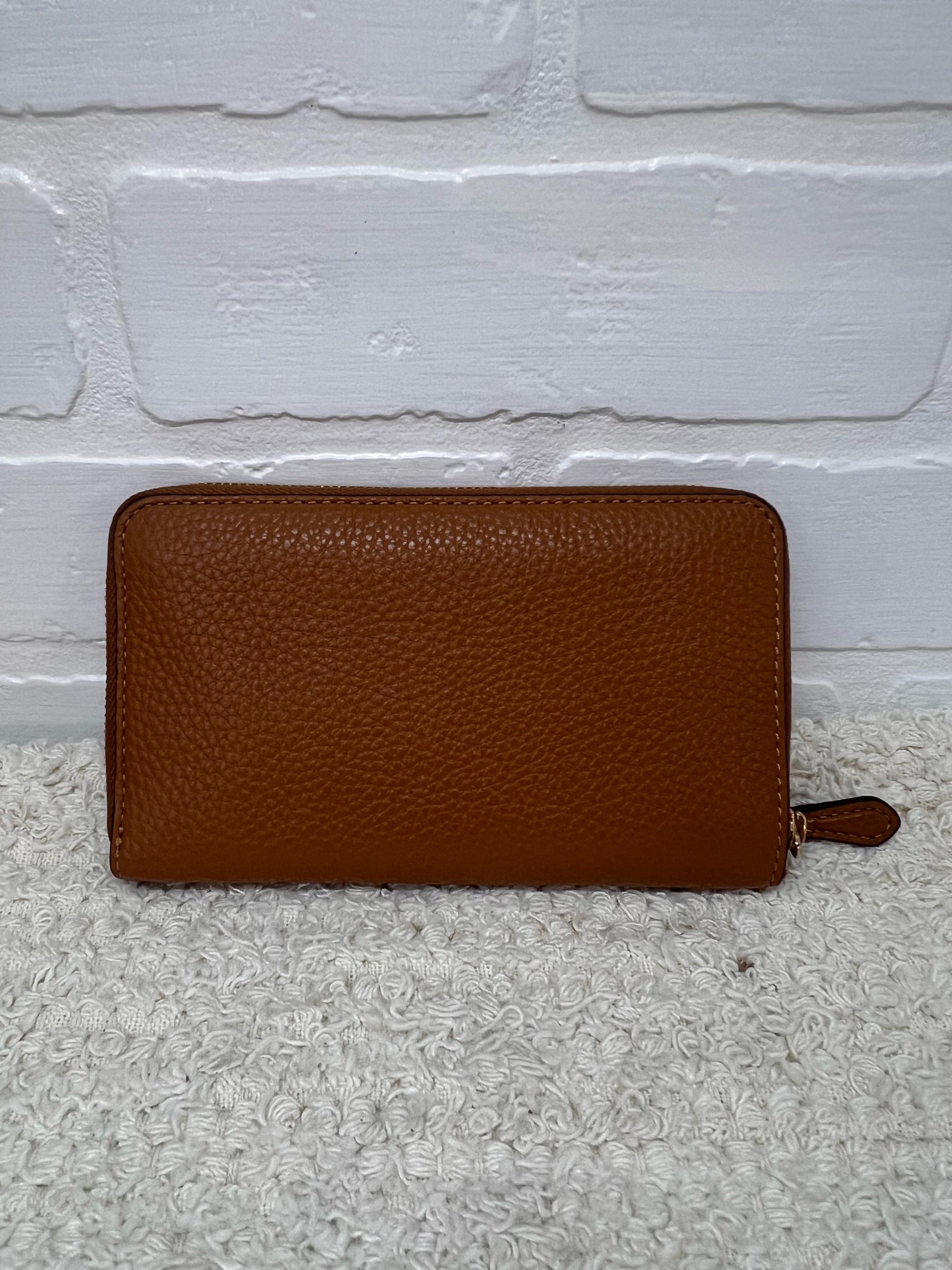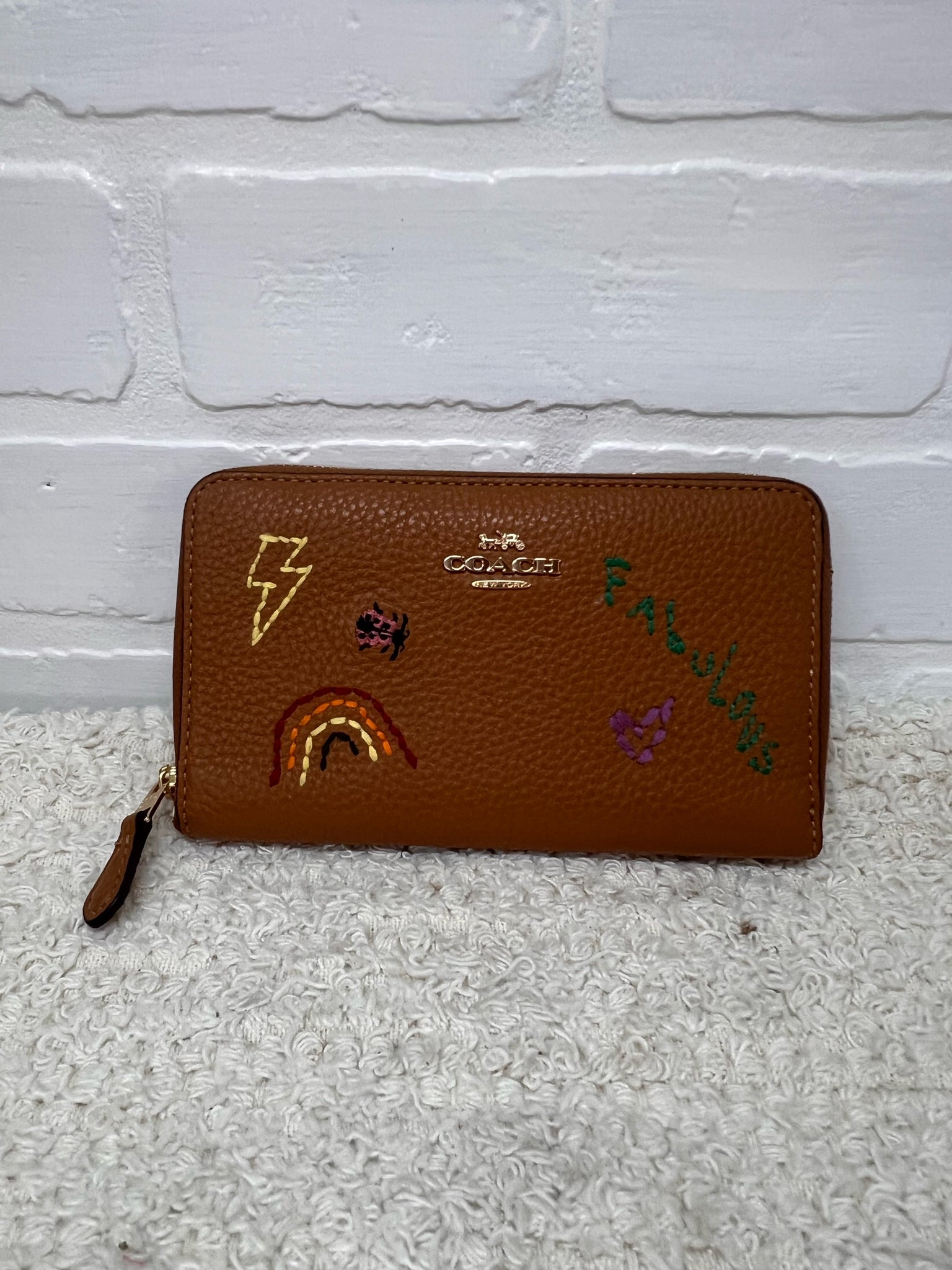 Brown pebbled leather w/ embroidered designs. Comes w/ a coordinating brown leather wallet. Gently, rarely used bag. Zip closure w/ fabric lining, handles w/ 3.75" drop. Crossbody strap has 22" drop. Bag has outer zip pocket. Wallet 6.5 x 4 x .75"