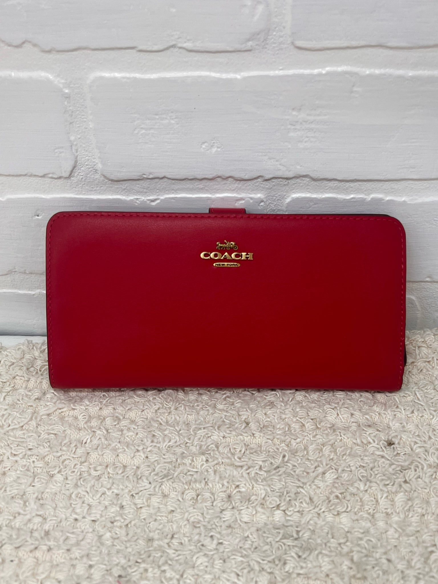 Smooth red leather wallet from Coach. Unused, fabric lining, goldtone hardware, measures approx 8 x 4 x .5 inches. Zipper pouch for coins and other items, lots of card slots for all your stuff!