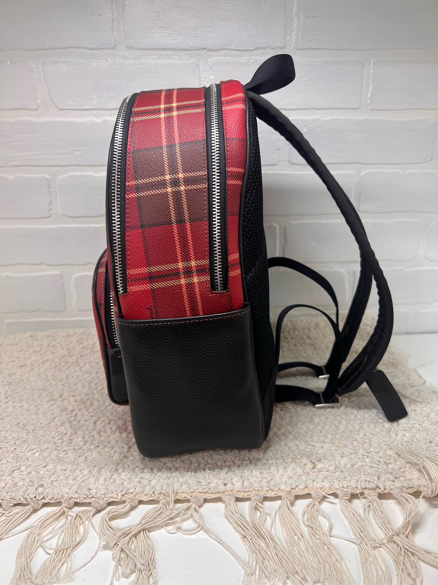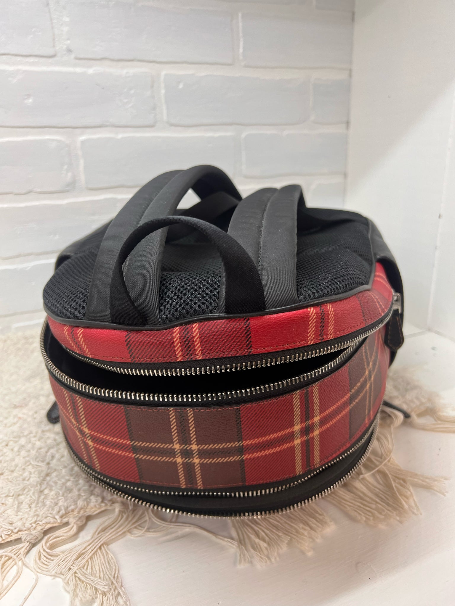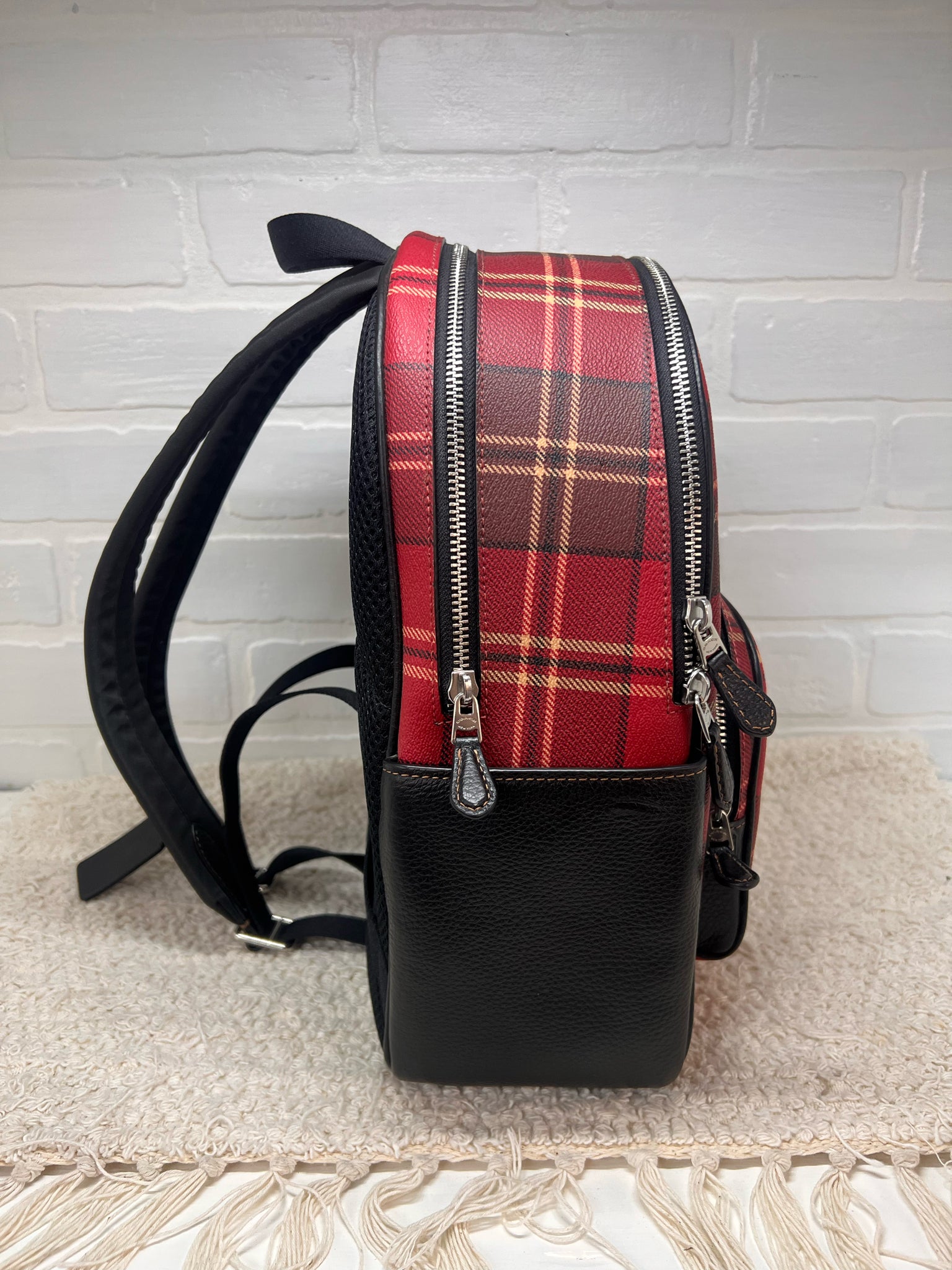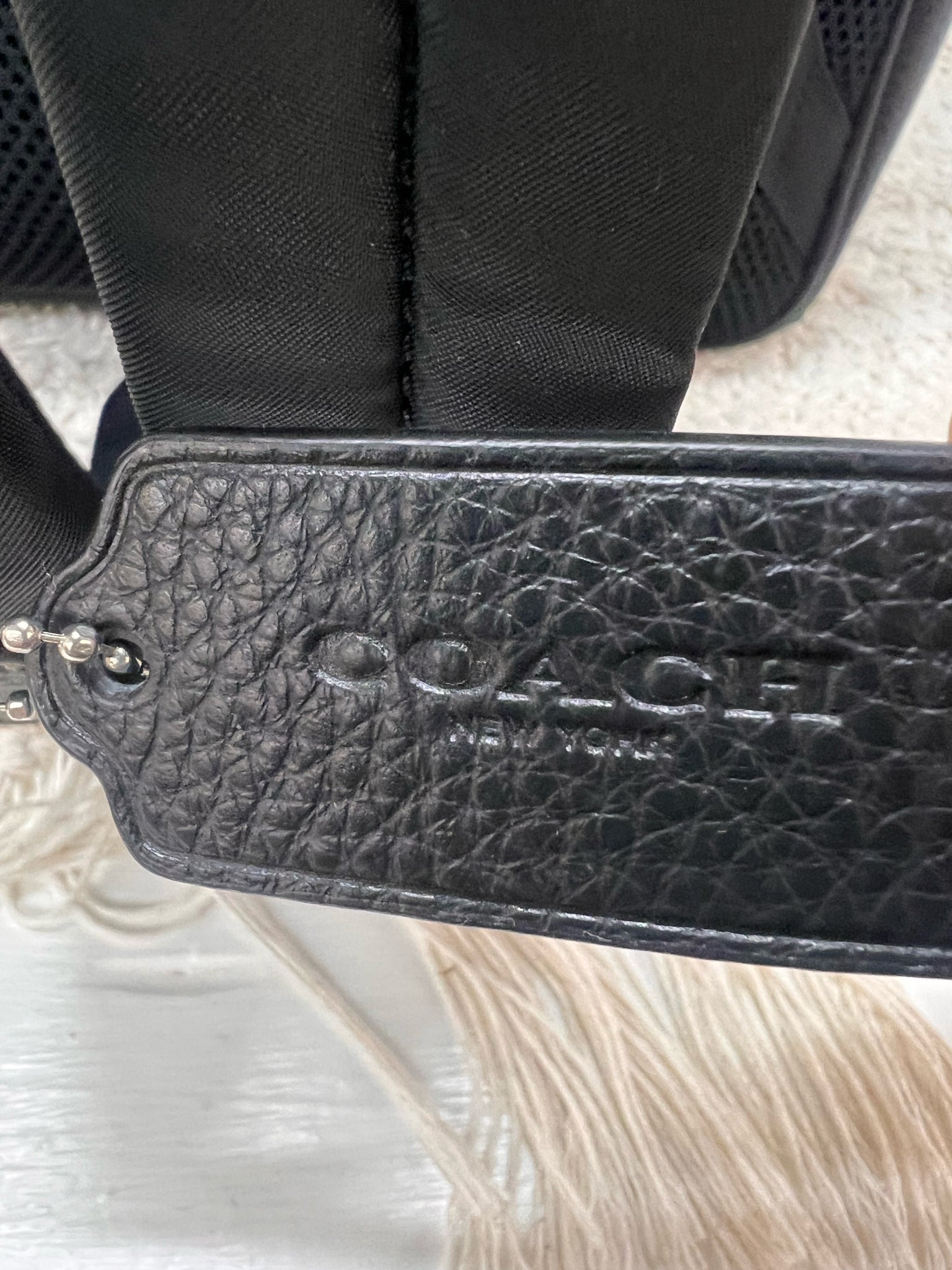 Printed coated canvas & refined pebble leather. Inside zip & multifunct. pockets. Double zip closure, fabric lining. Handle w/ 2.25" drop. Outside zip pocket. Adjustable shoulder straps. Like new condition! 12.5" high, 4.75" wide, 10.75" long. STUNNING