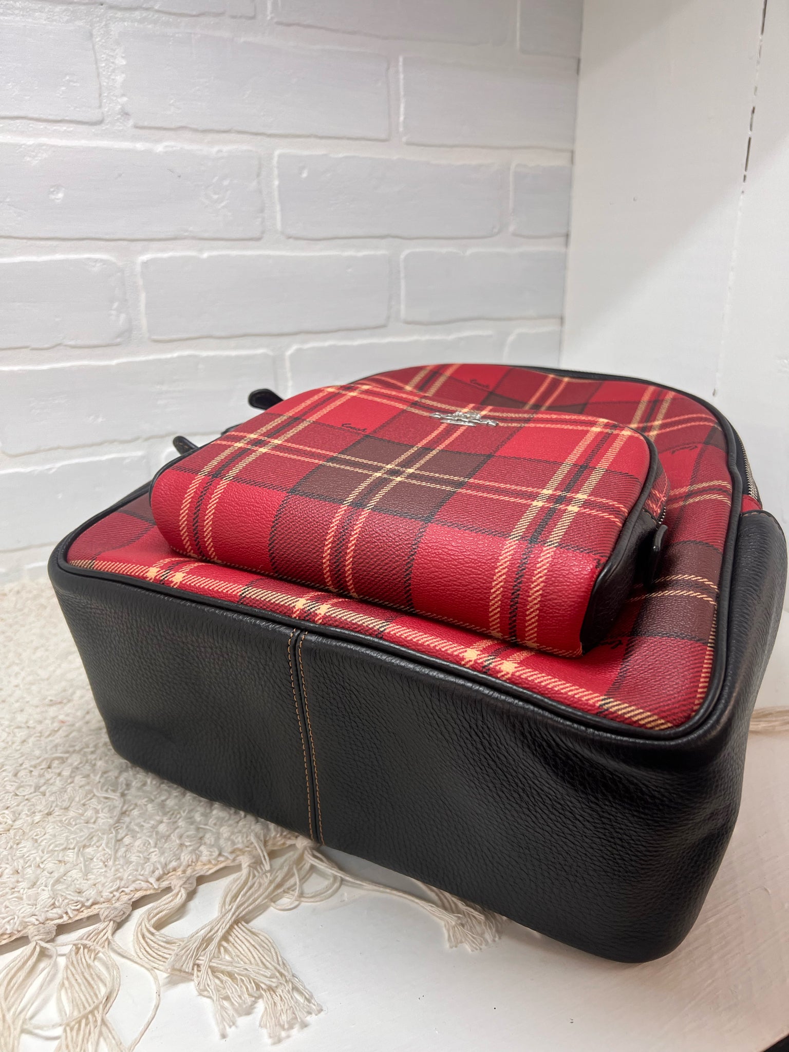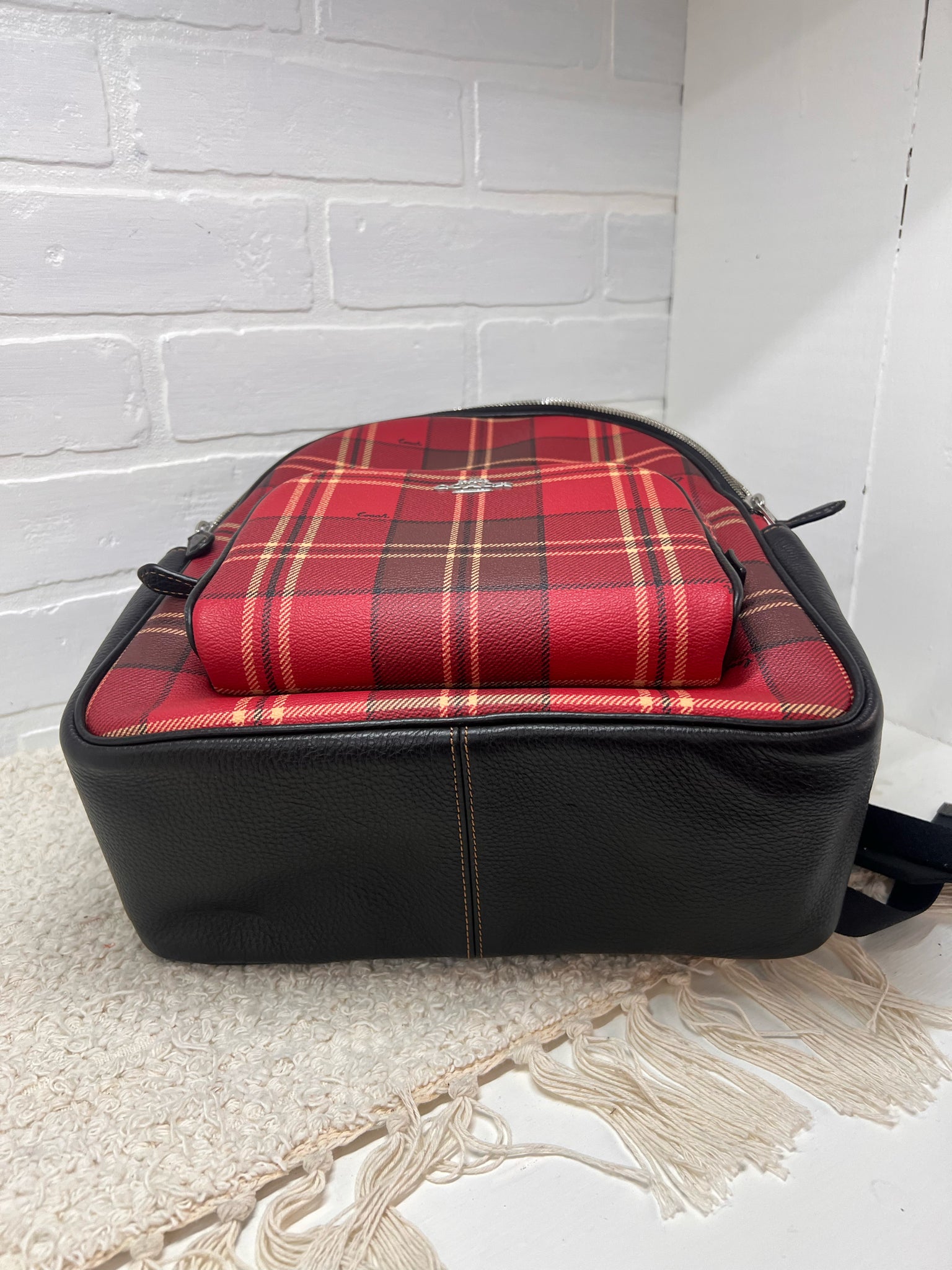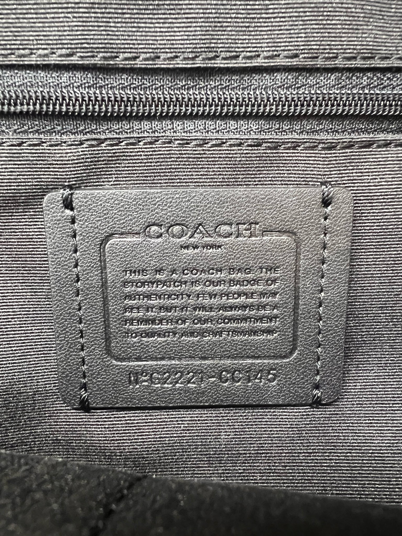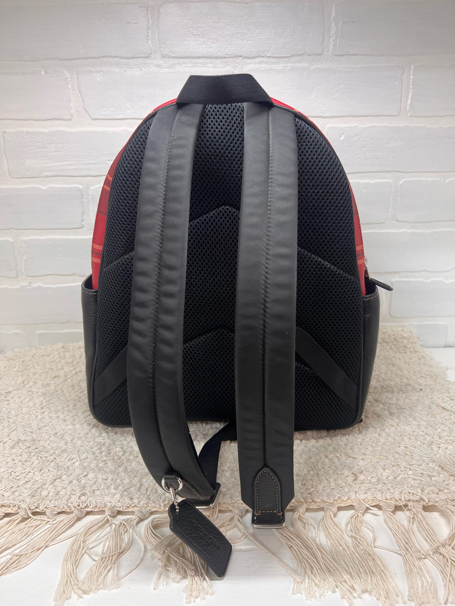 Printed coated canvas & refined pebble leather. Inside zip & multifunct. pockets. Double zip closure, fabric lining. Handle w/ 2.25" drop. Outside zip pocket. Adjustable shoulder straps. Like new condition! 12.5" high, 4.75" wide, 10.75" long. STUNNING