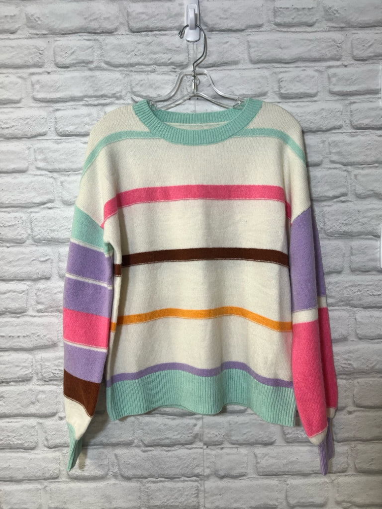 A super soft knit sweater in fun retro pastels! This crew neck, long sleeved sweater is white with pops of pink, light blue, purple, brown and yellow. You'll find yourself pulling this sweater out of your closet again and again!