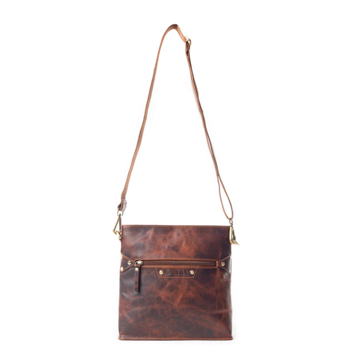 This burnished leather crossbody blends Southwest charm with timeless style. Hand-distressed cowhide, brass hardware, and fine stitching create a rugged yet refined look. Zipper top, adjustable strap—your perfect trail-to-town companion.