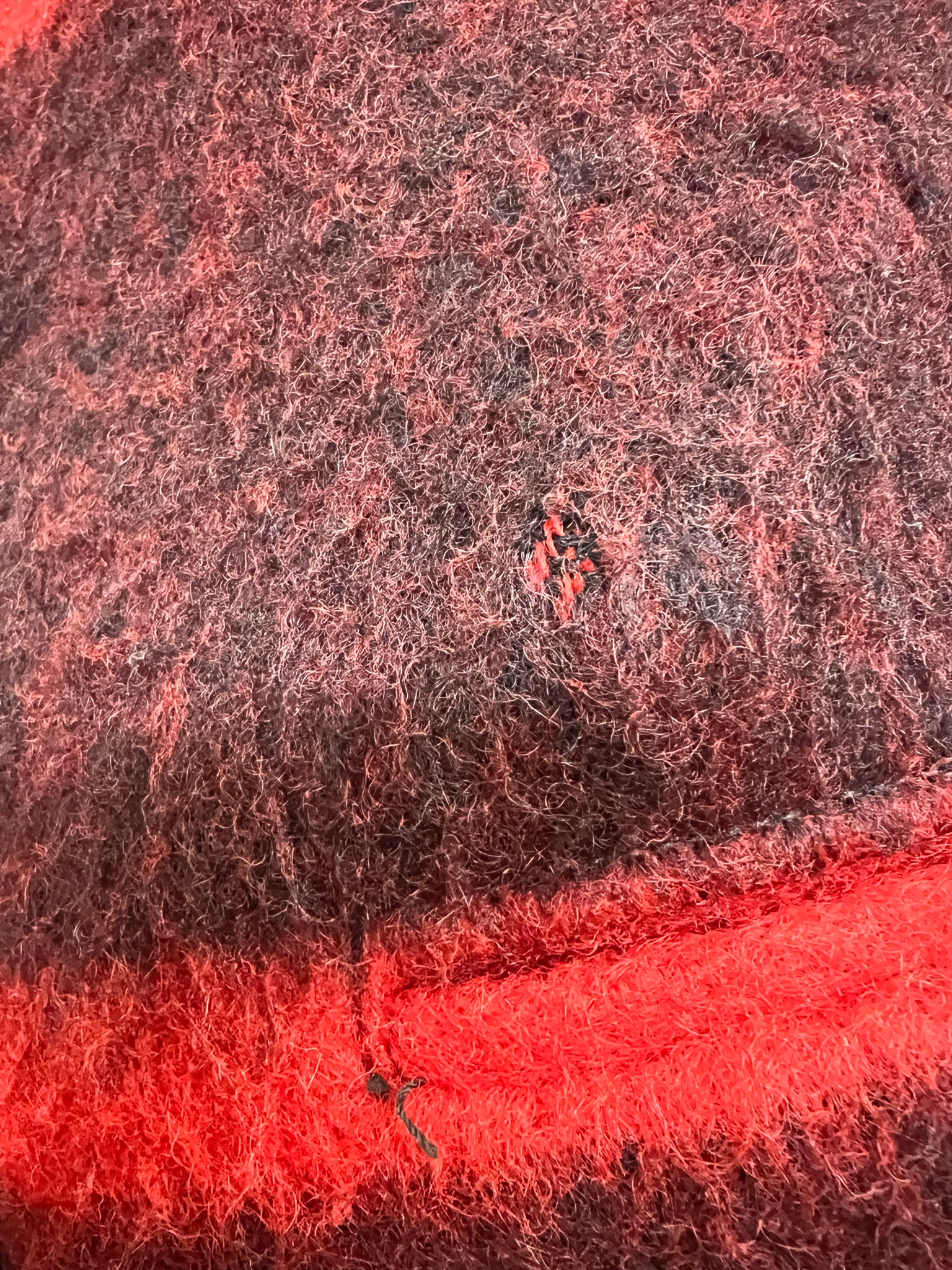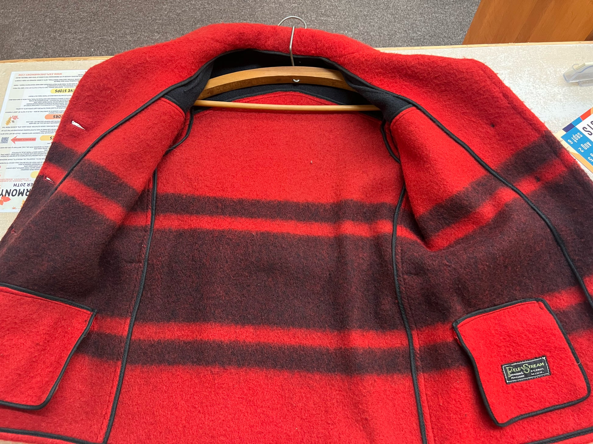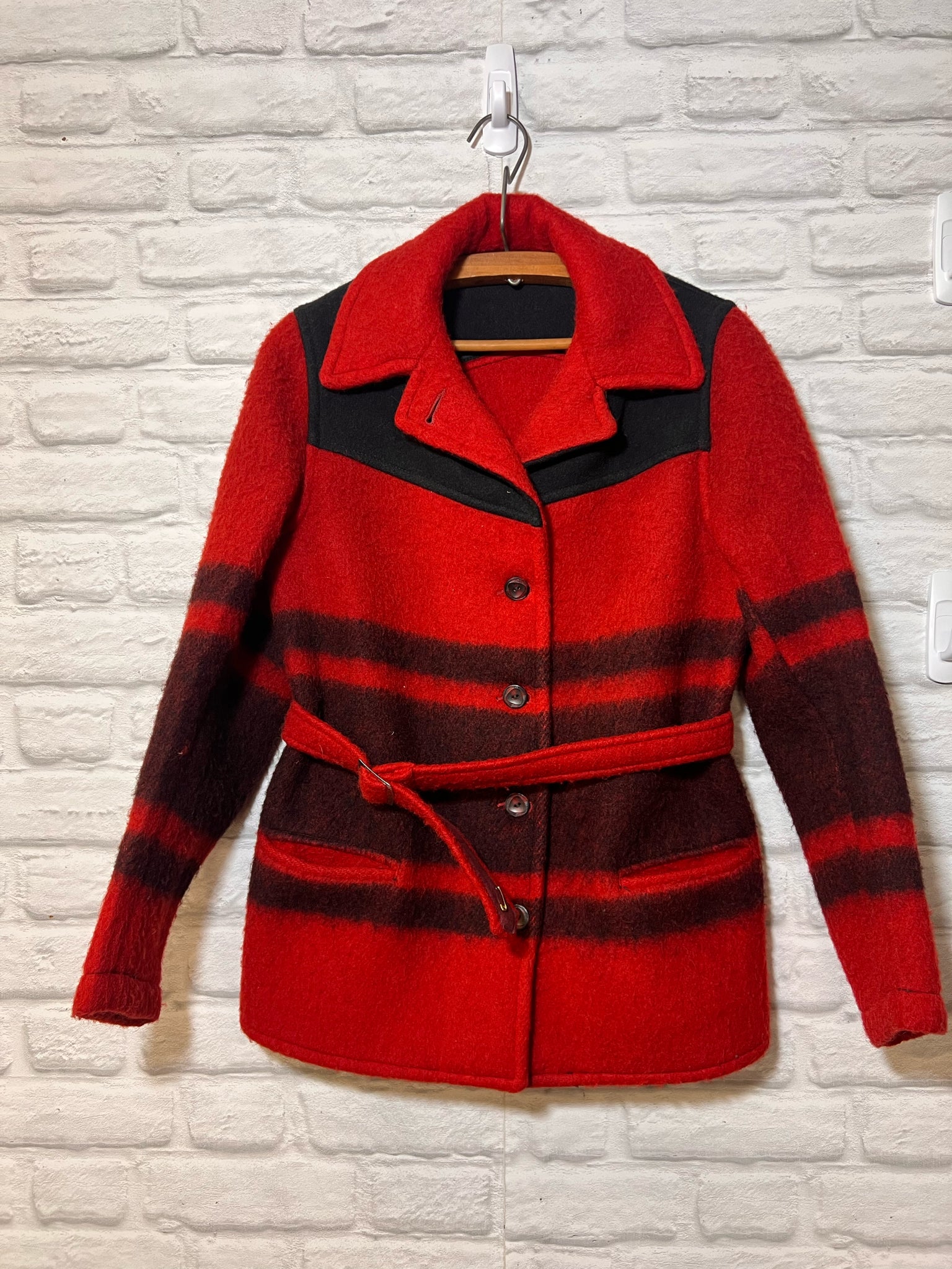 Women's wool coat from Field & Stream. Red and black felted wool w/ removable belt. Areas of wear but no actual holes. Armpit to Armpit measures 19" flat, waist 18" flat, length from shoulder 26". Sleeve length 17" from armpit, 23" from shoulder.