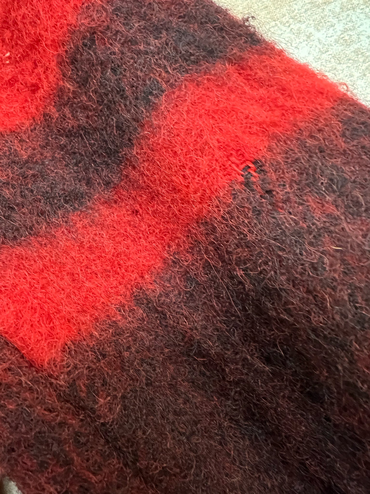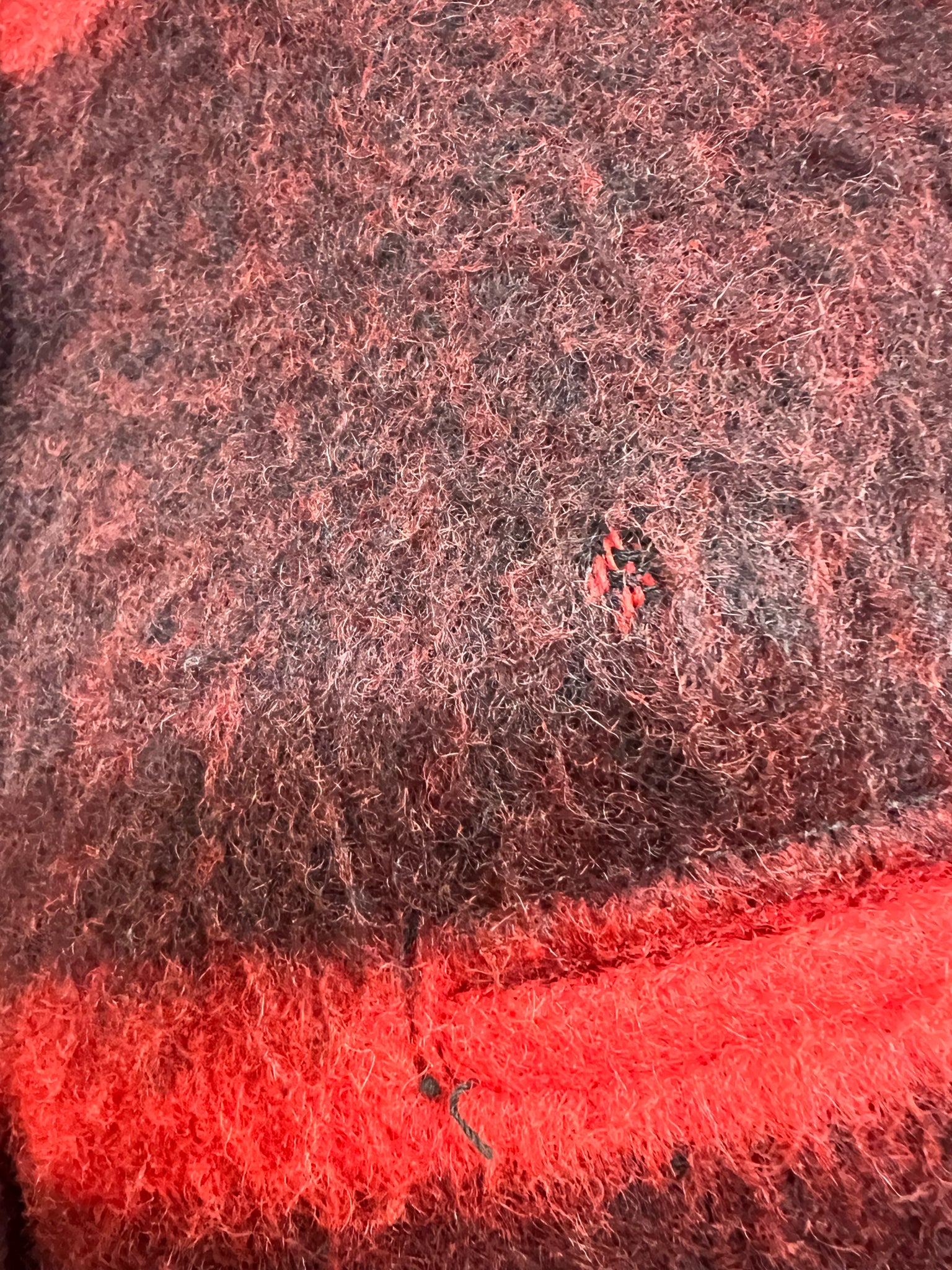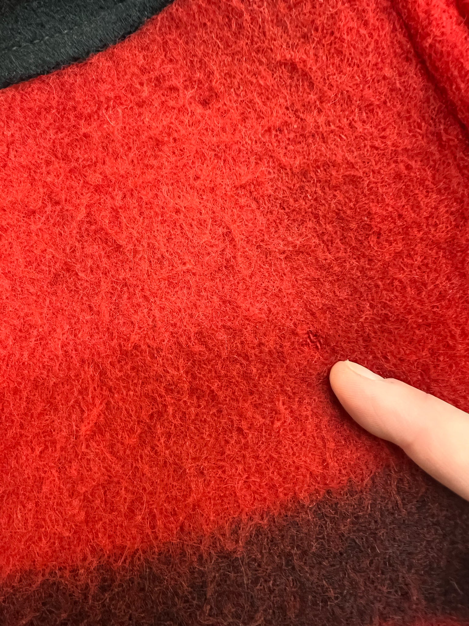 Women's wool coat from Field & Stream. Red and black felted wool w/ removable belt. Areas of wear but no actual holes. Armpit to Armpit measures 19" flat, waist 18" flat, length from shoulder 26". Sleeve length 17" from armpit, 23" from shoulder.