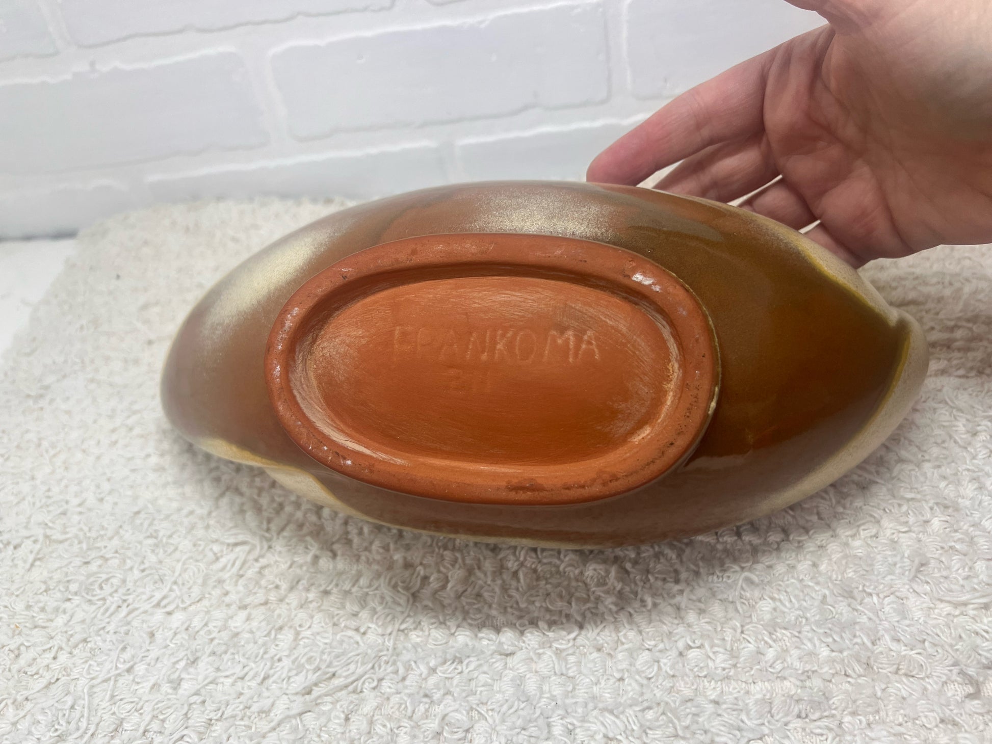 Marked '211' on the bottom, this Frankoma bowl is in the desert gold brown/cream glaze. An excellent planter or art object, this bowl measure approx 12" long, 5" wide, aprox 5.5" tall at tallest side. Shows some wear inside from use.