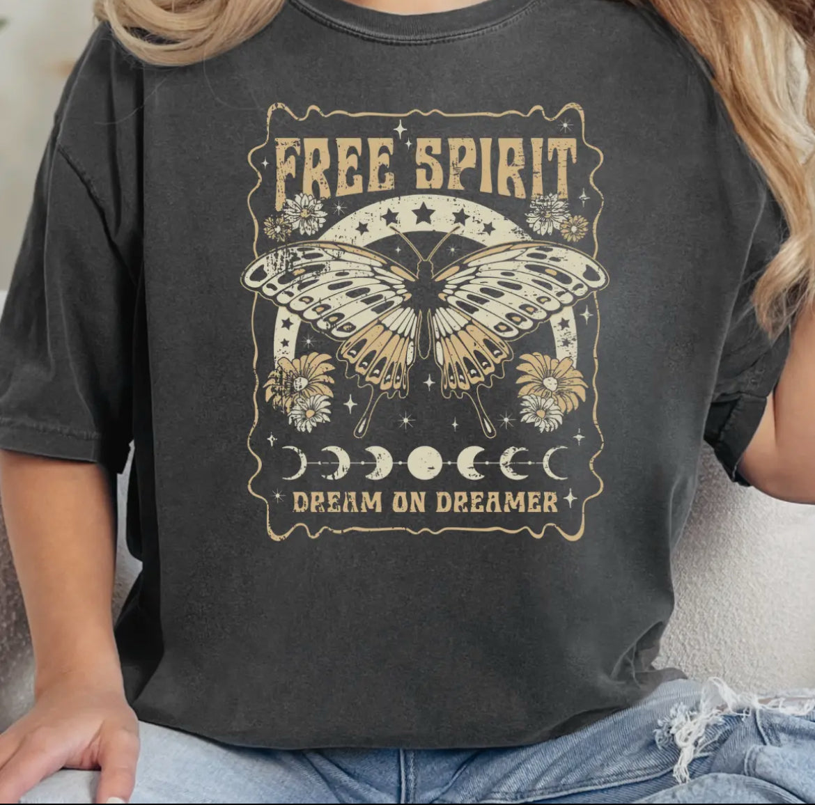 Free Spirit Crew Neck Comfort Color Tee- groovy graphics featuring a moth, flowers, moon phases and stars. Dream on dreamers! Super soft and comfortable tee Brand - Comfort Colors Fit - Unisex Fabric - 100% cotton