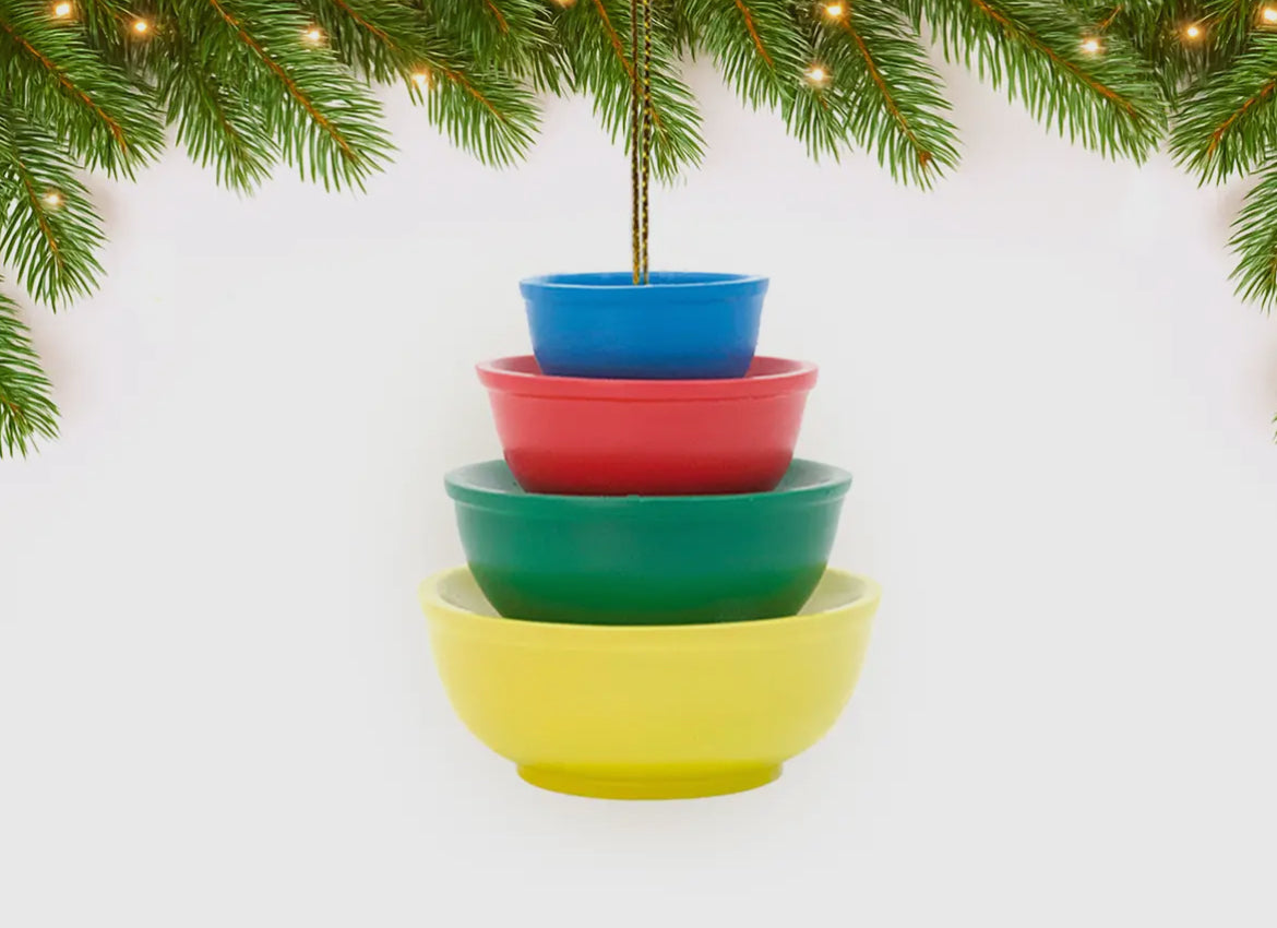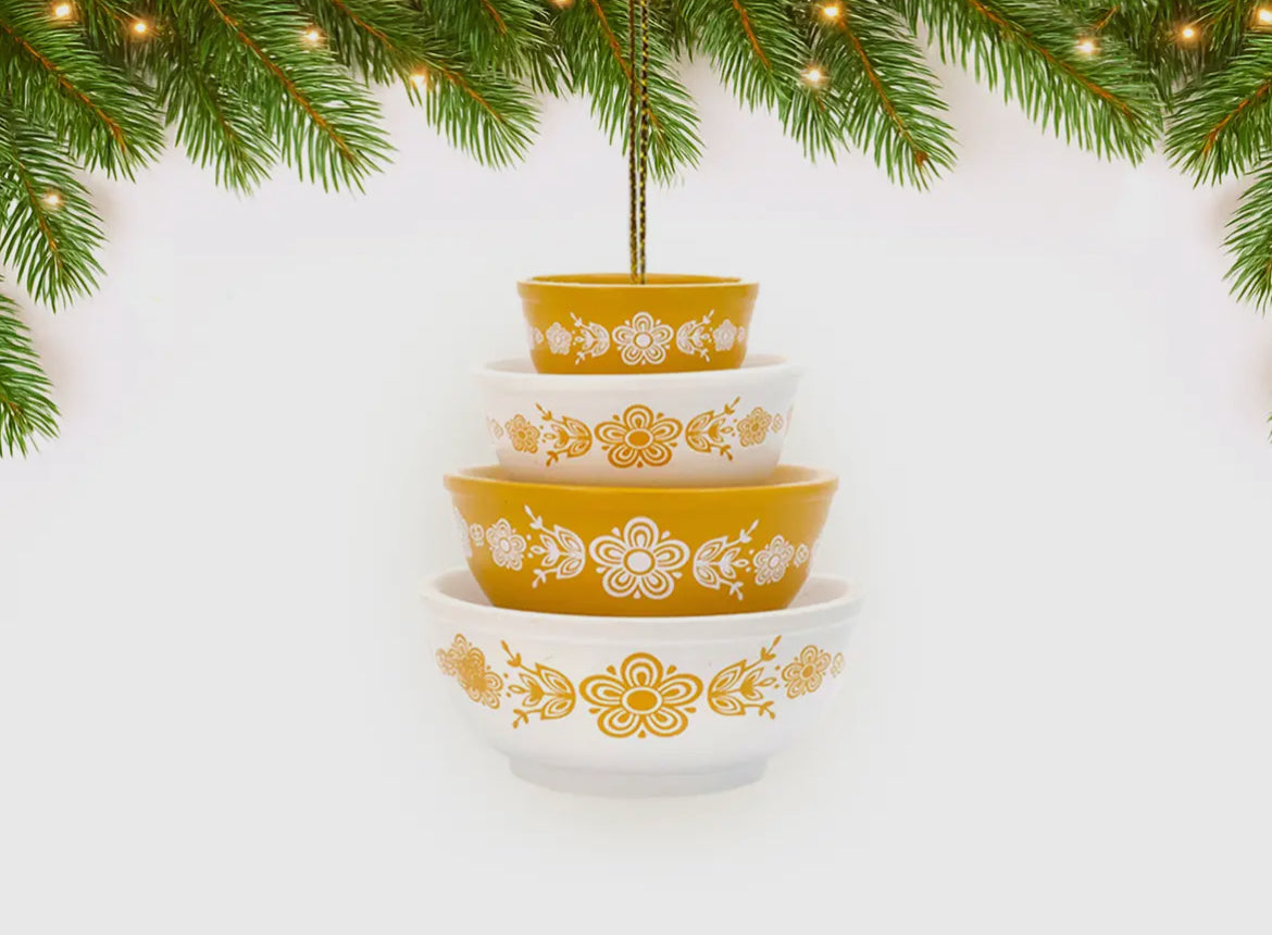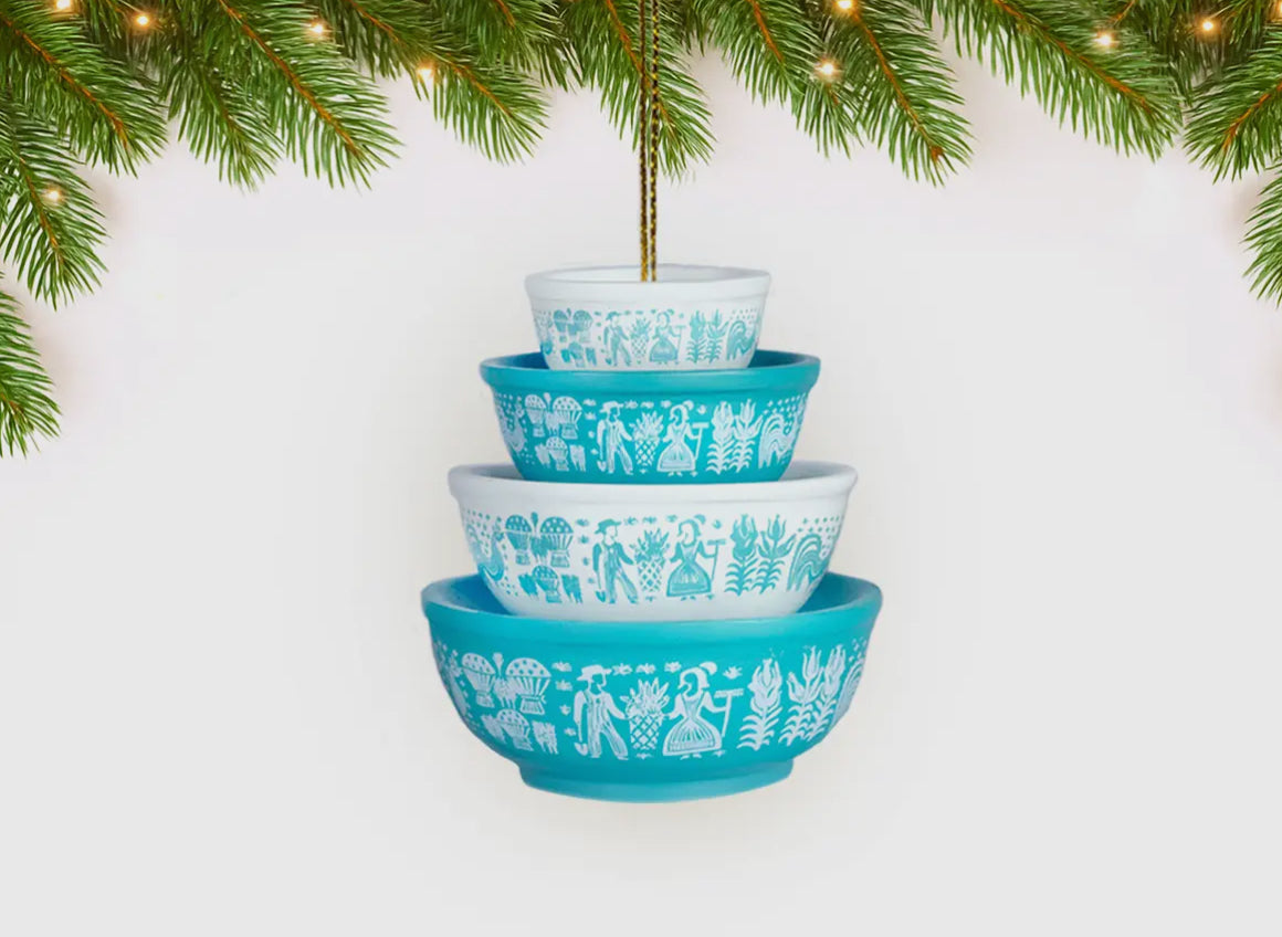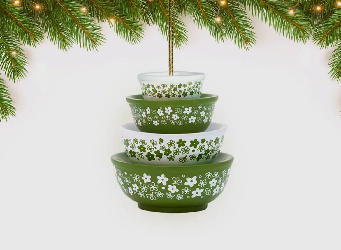 Hand-crafted resin ornaments in a variety of vintage Pyrex inspired patterns. Each ornament looks like a stack of Pyrex bowls! Perfect for collectors of Pyrex or anyone who has a touch of nostalgia for those lovely old bowls. Measures 2.5 x 2.5 x 3".