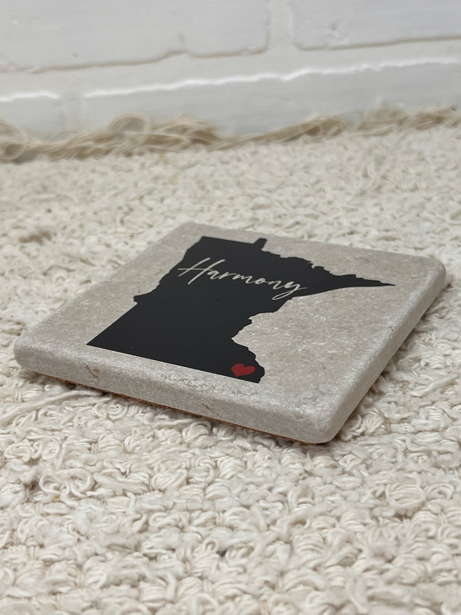 A 4" x 4" decorative tile coaster featuring the Minnesota silhouette with "Harmony" scripted across the center and a small heart detail. Neutral stone look finish pairs easily with any decor while protecting surfaces in style!