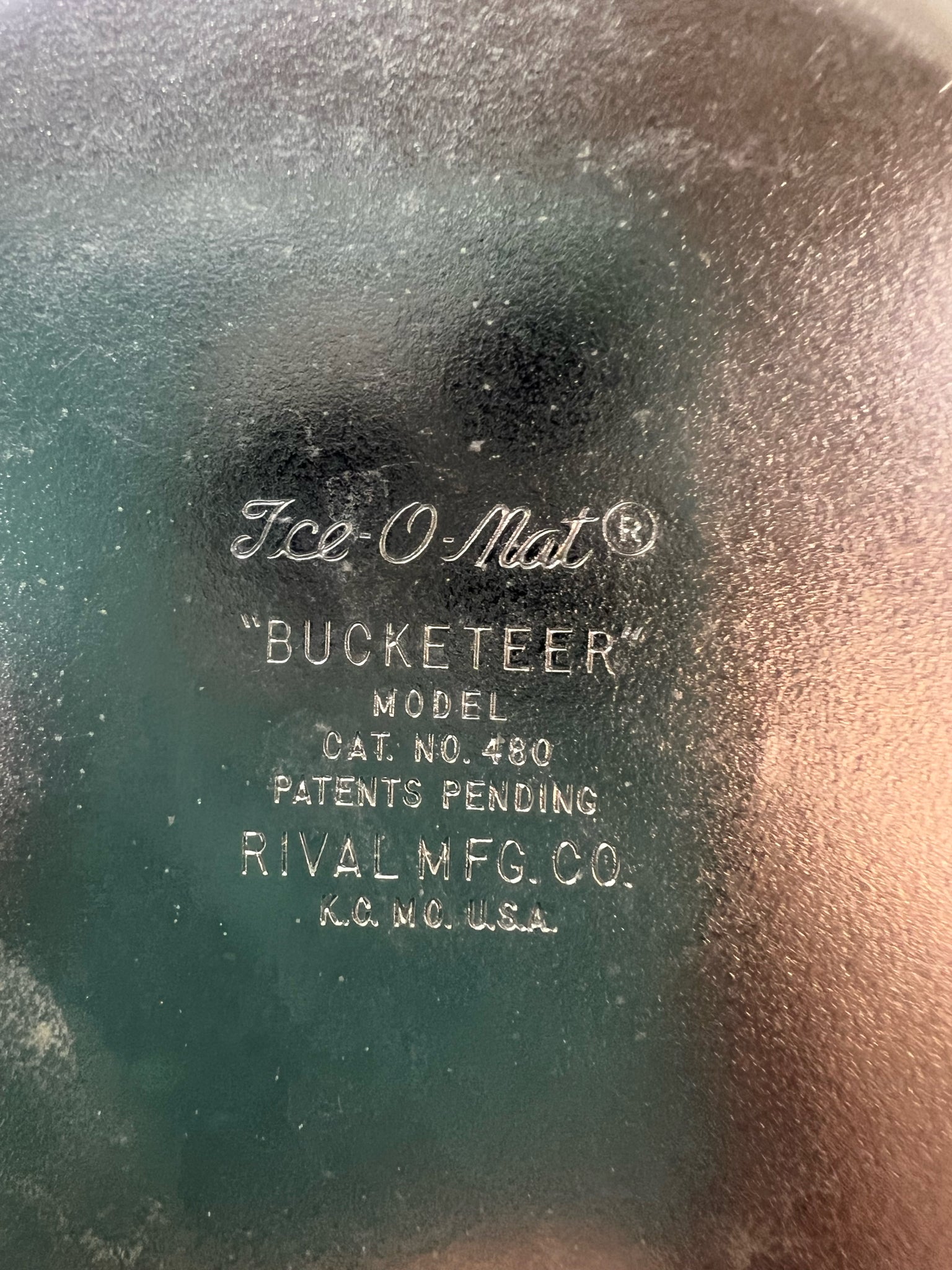 "The Bucketeer" Ice-O-Mat ice grinder from Rival. Fabulous MCM chrome ice grinder is just what you need for entertaining in MCM style. Very good vintage condition with light areas of wear. Great shiny chrome! Measures 8.5". Meant to be wall mounted.