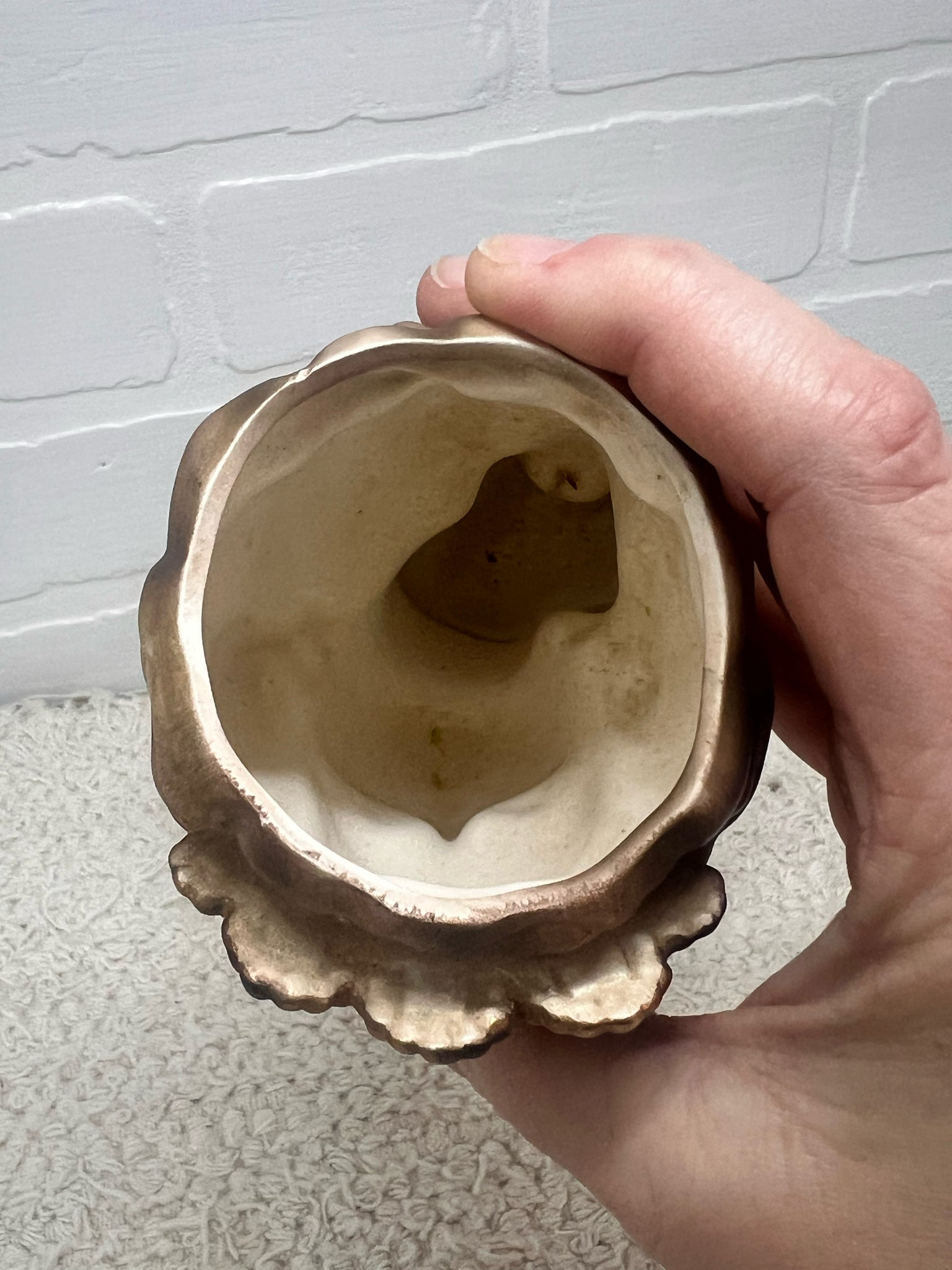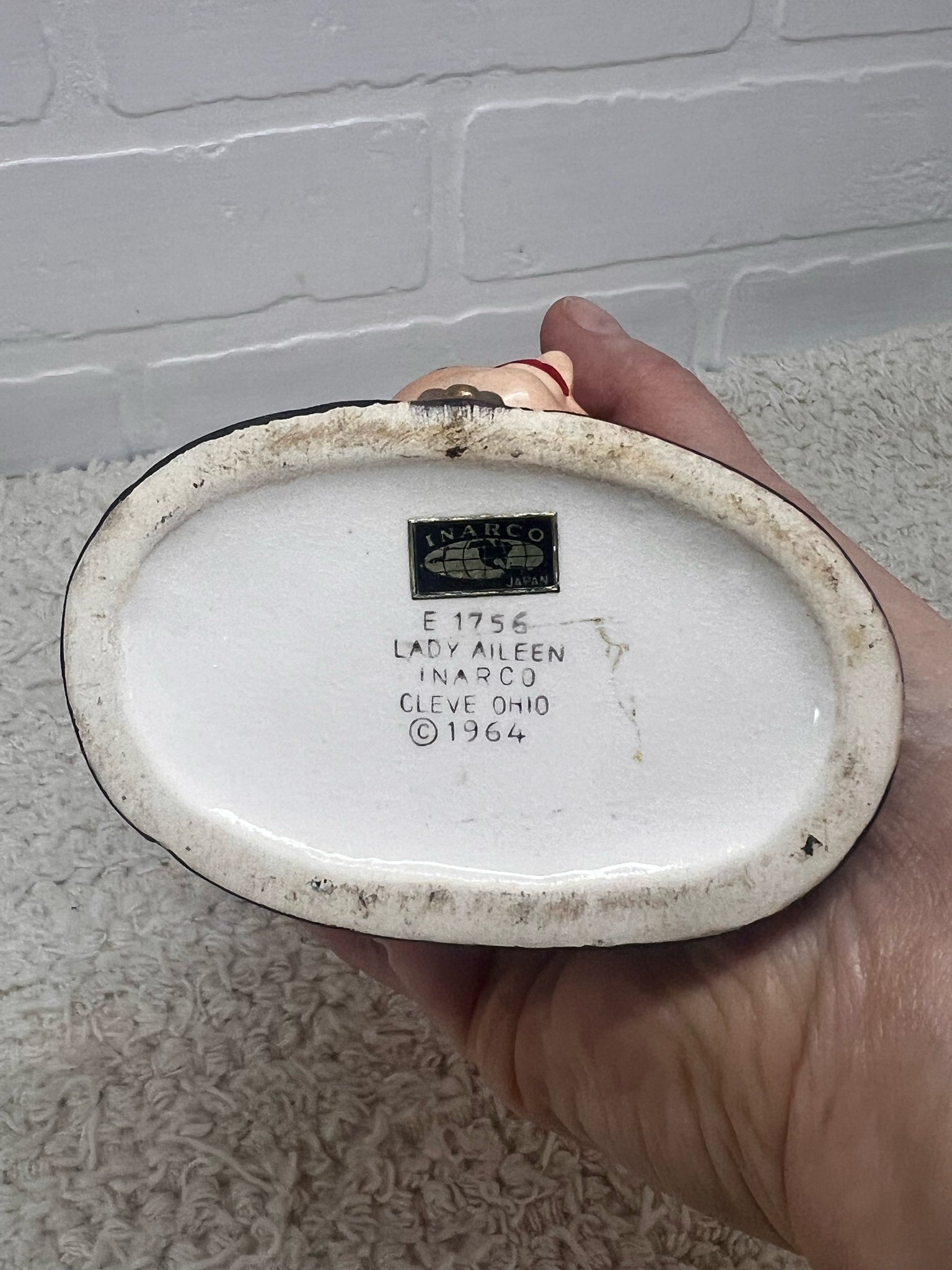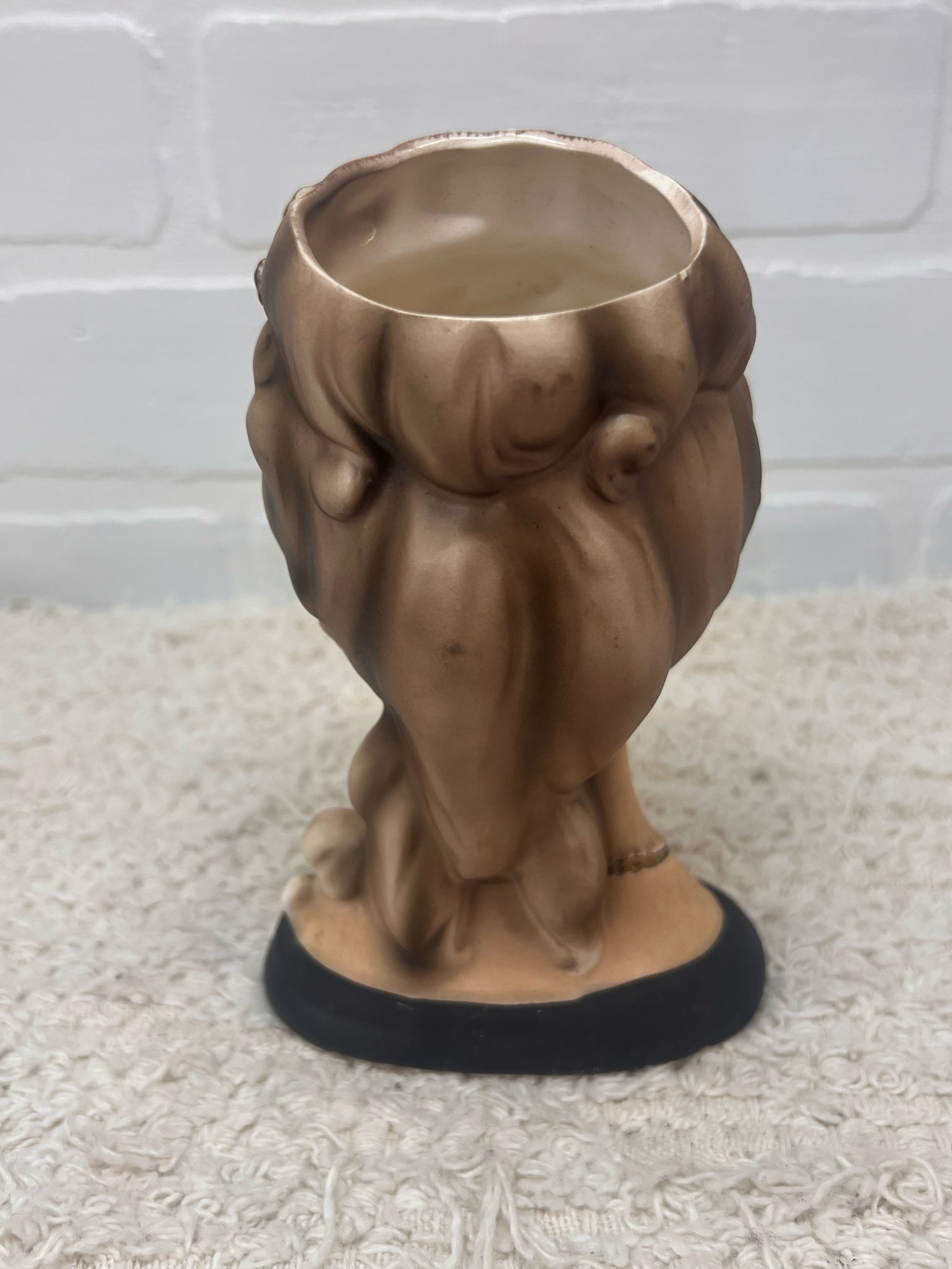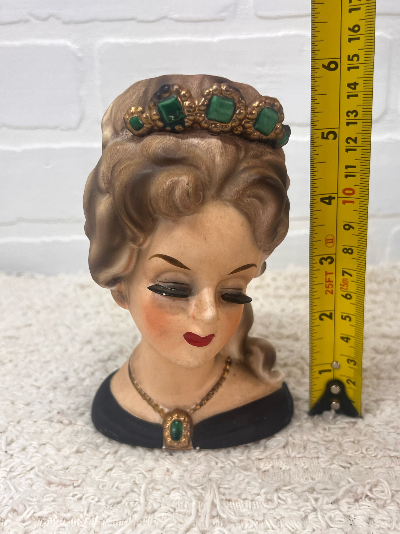 Vintage lady head vase 'Lady Aileen' elegant 60's lady with long lashes and painted on gold & green jewelry. Slight chip noted to right eyelash paint, and faint crazing noted on bottom, as well as inside vase staining. Measures approx 5.5" tall, 4" wide.