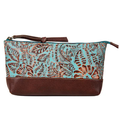 Simple and refined, this gorgeous bag features turquoise hand-tooled leather with rich bourbon chocolate accents. The organized interior has special compartments, a zipper-close top, and a matching leather wristlet strap. Stylish and practical for many us