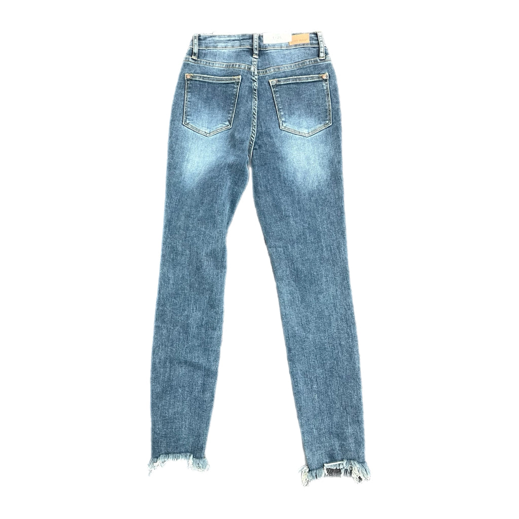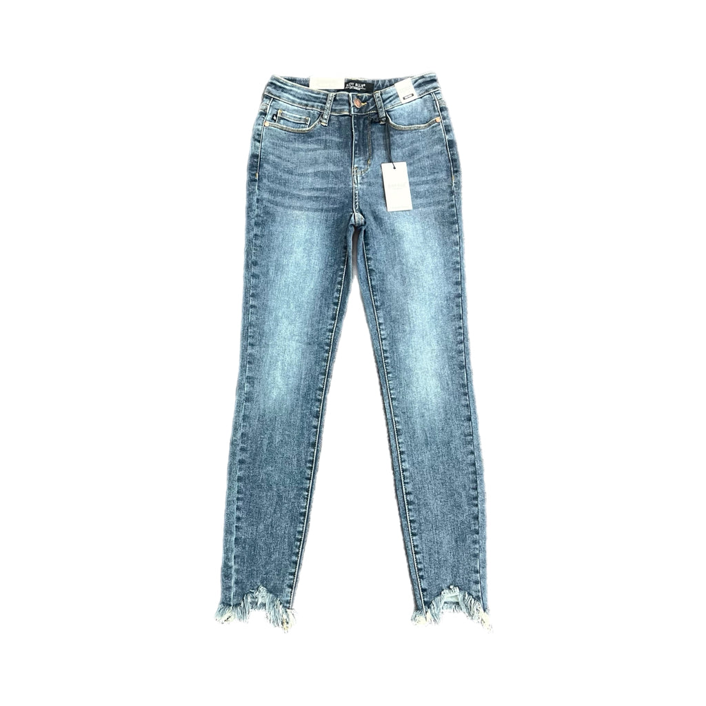 Mid-rise skinny fit jeans from Judy Blue featuring sharkbite shredded hems. Great wardrobe staple!