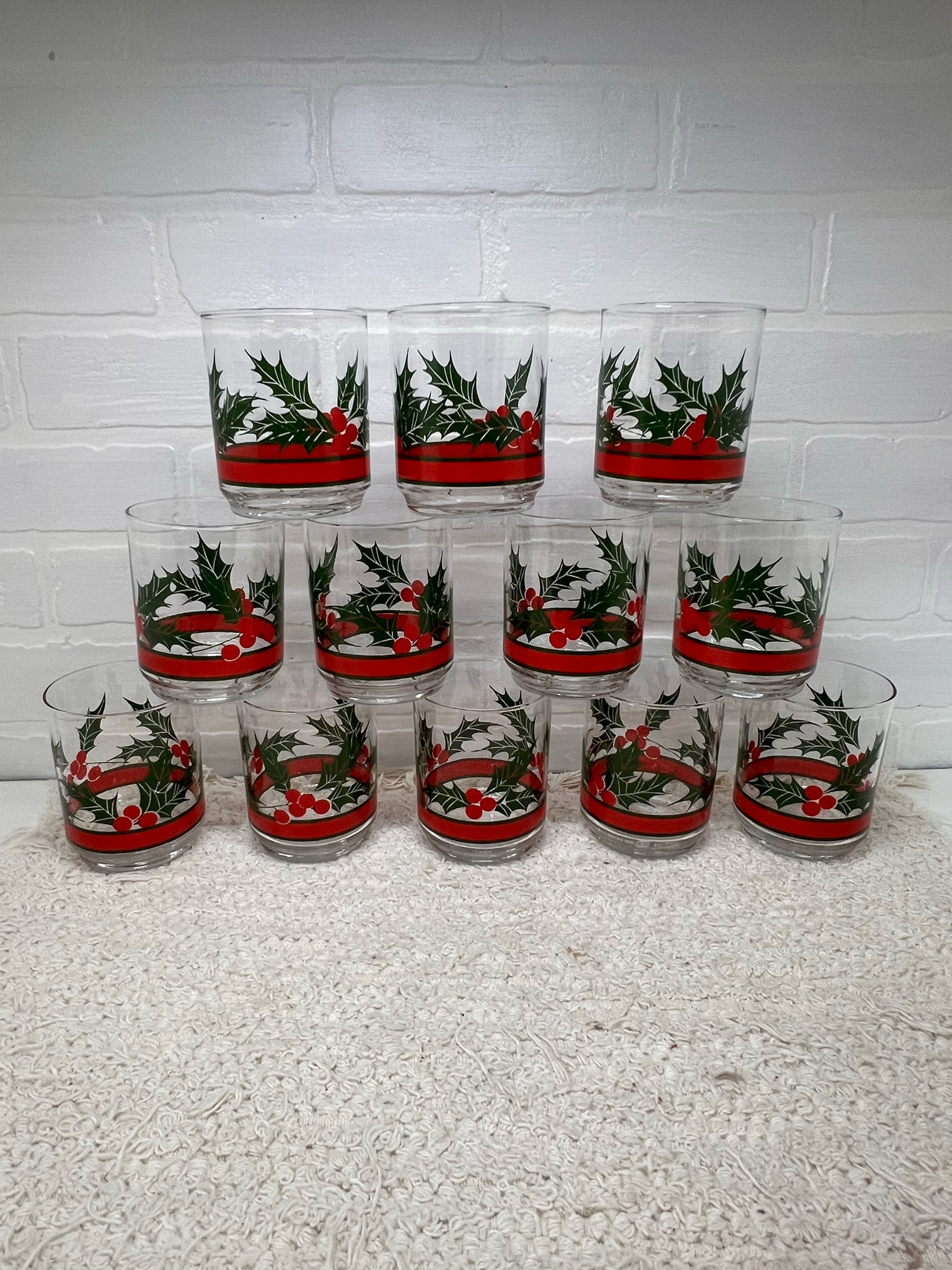 Set of 12 vibrantly printed green & red holly pattern tumblers from Libbey. In original box and appear to be rarely used Each tumbler measures 4" tall & 3.25" across.