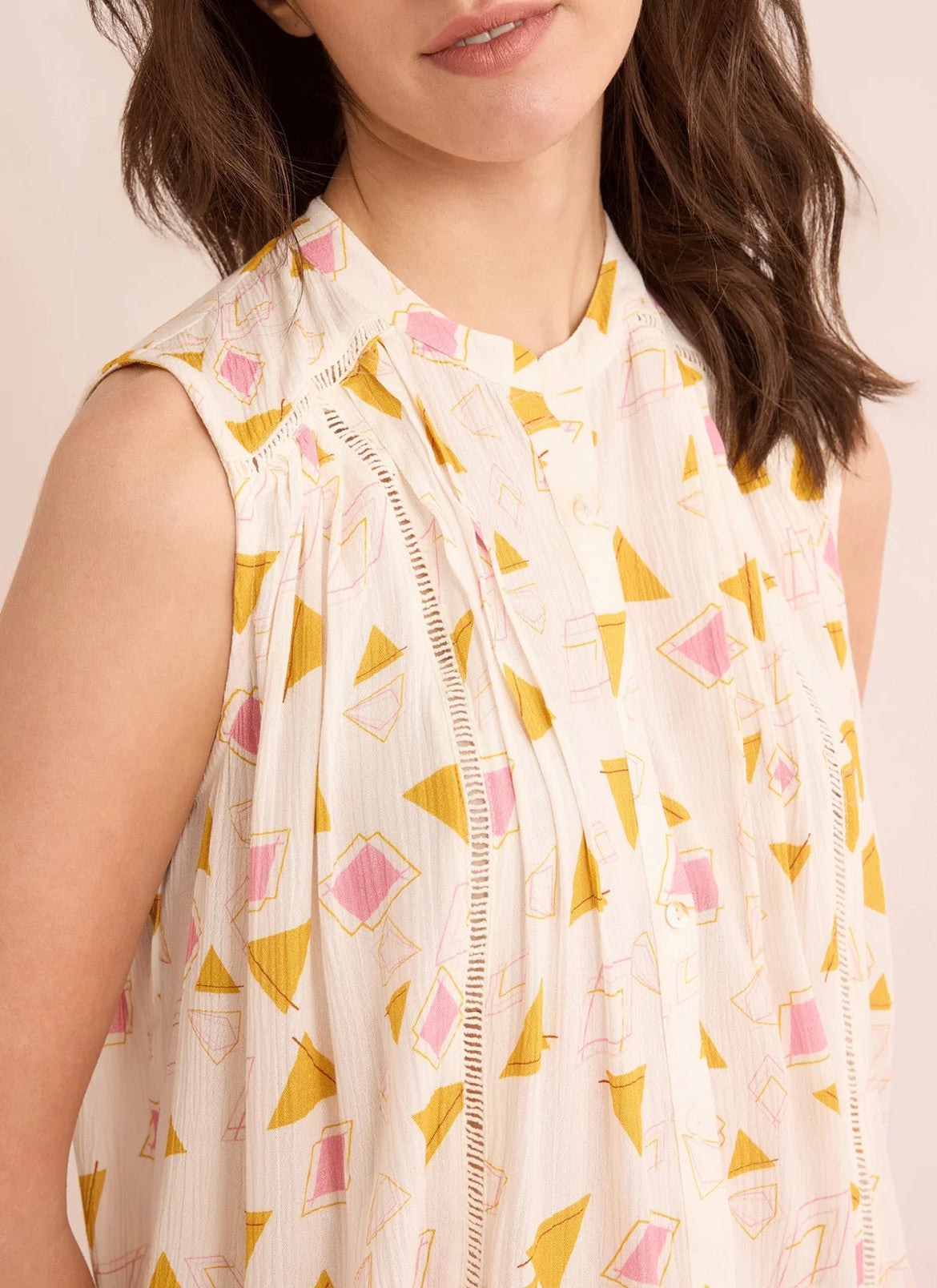 Airy white cotton blouse with playful mustard triangles and blush diamond accents. Features delicate ladder-stitch detailing, pintuck pleats, a mandarin collar, and button-front design—blending vintage-inspired charm with a clean, modern finish.