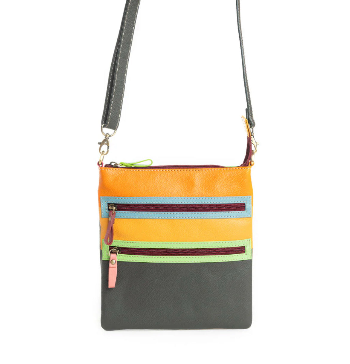 Playful yet practical leather bag featuring bold color blocking in sunny yellow, charcoal gray, and fresh green with multicolor zipper accents. Finished with a zip-top closure and detachable adjustable leather strap—perfect for everyday statement style.