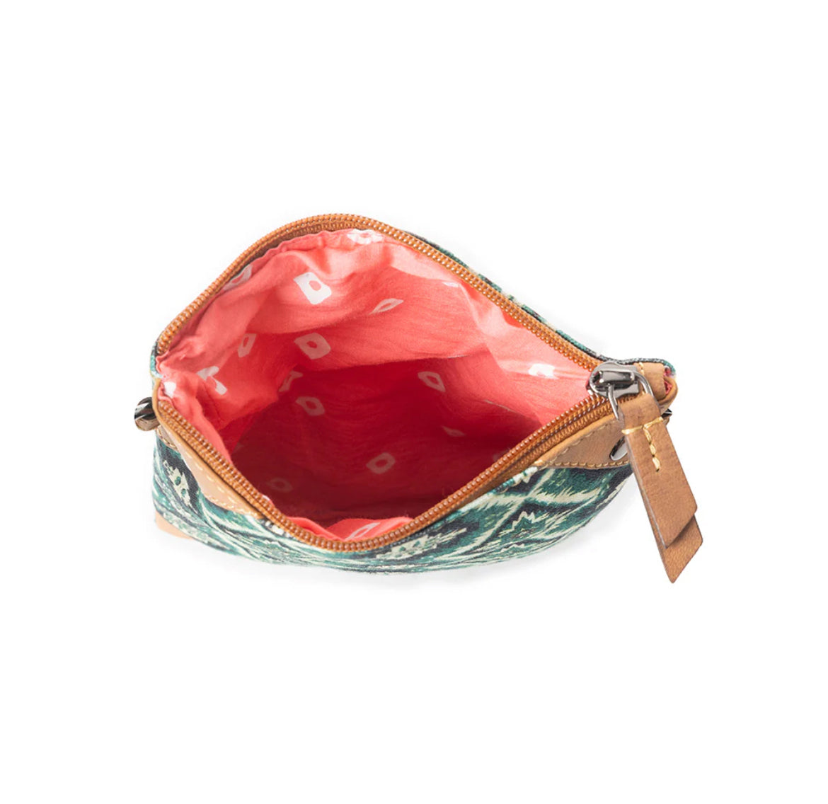 Southwest-inspired crossbody pouch with an emerald and cream geometric pattern, framed by tan leather accents. Features a zip-top closure, handy back zip pocket, and matching leather strap—boho style with everyday practicality.