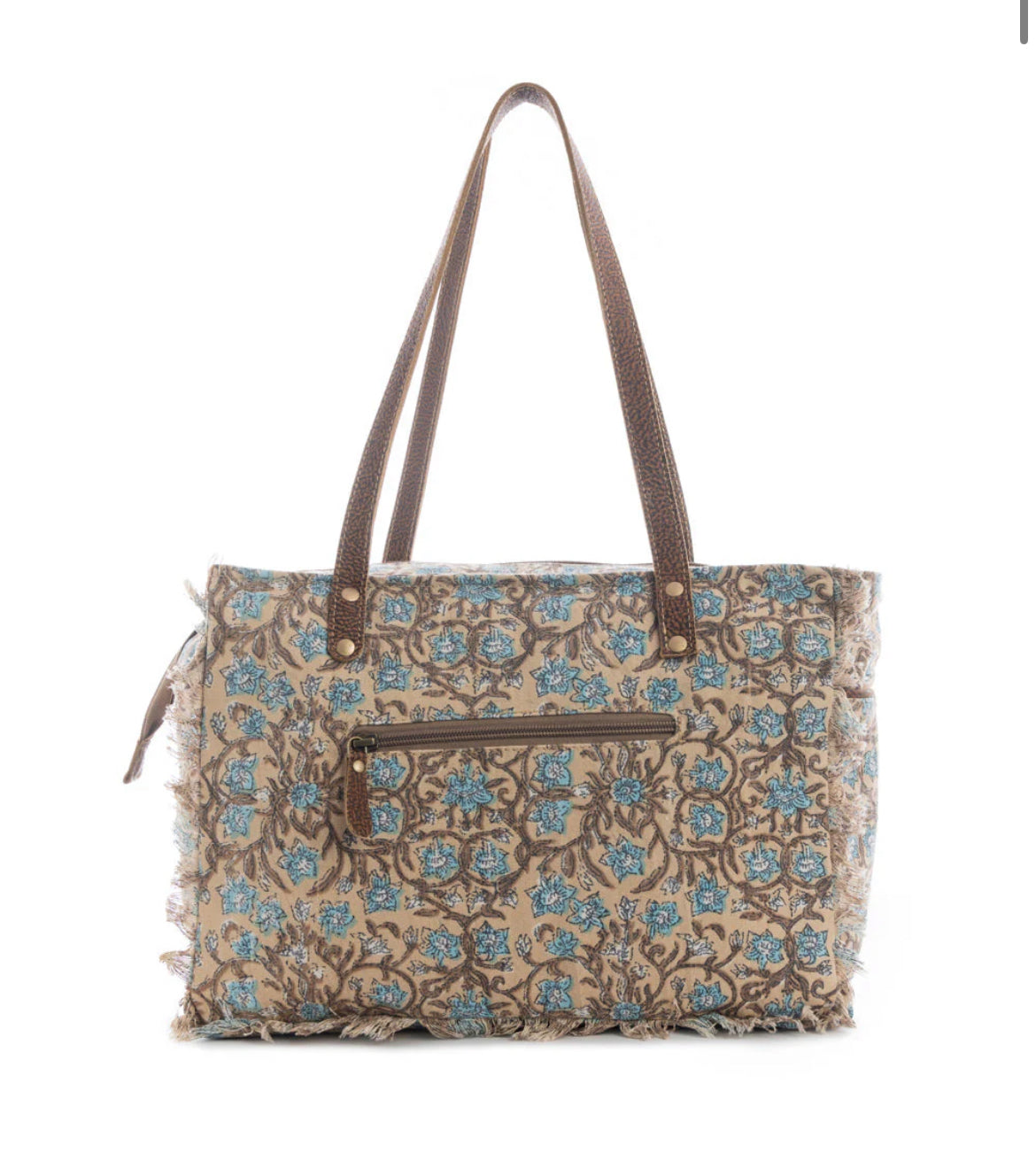 Myra Bag San Ysidro Falls Small Tote Bag – Floral Canvas & Leather Handbag with Frayed Edges and Zipper Pocket, 14"x10", Women’s Boho Everyday Bag