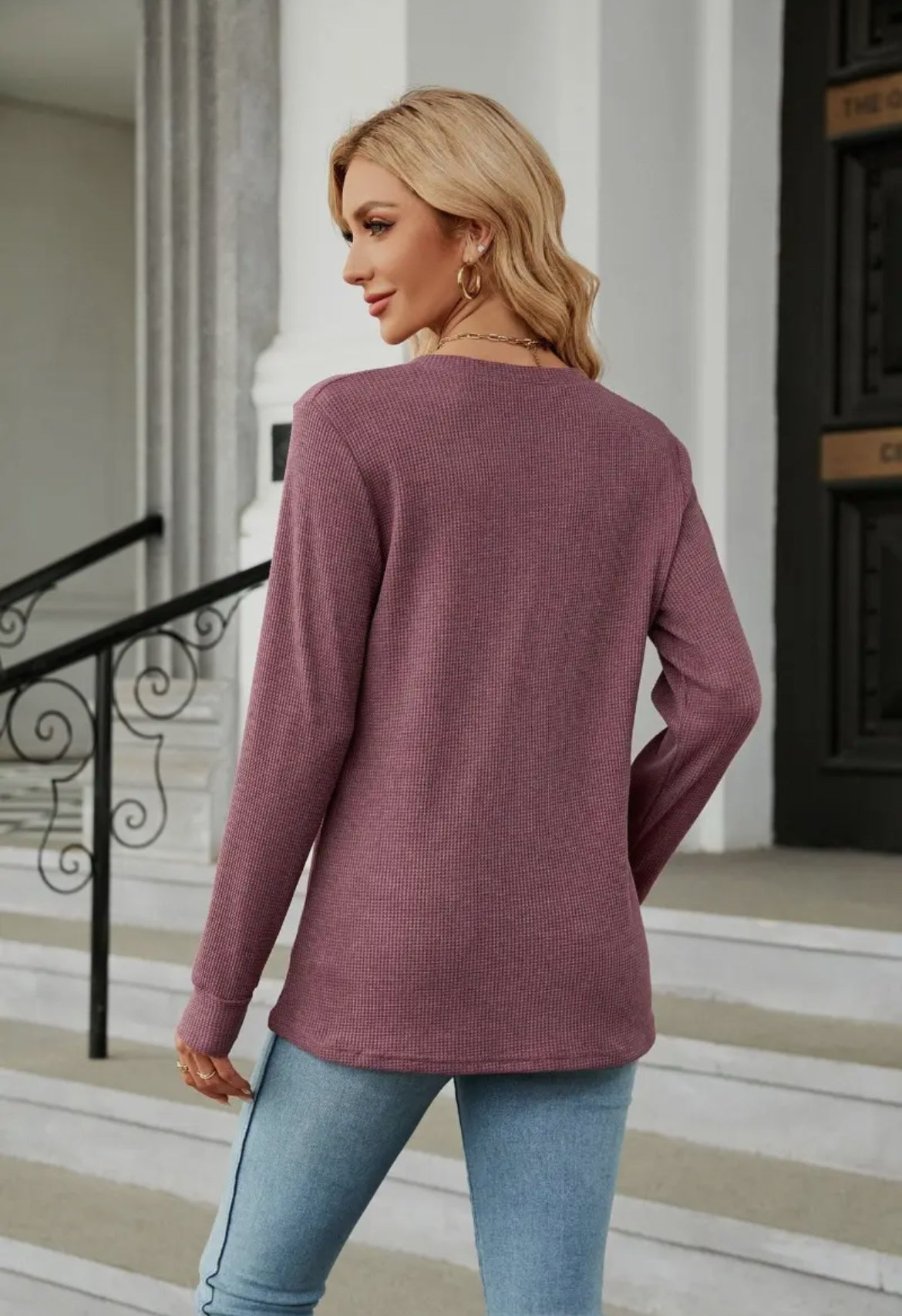 Lighter weight dusty purple waffle knit top featuring a v-neckline and buttons. Long sleeved.