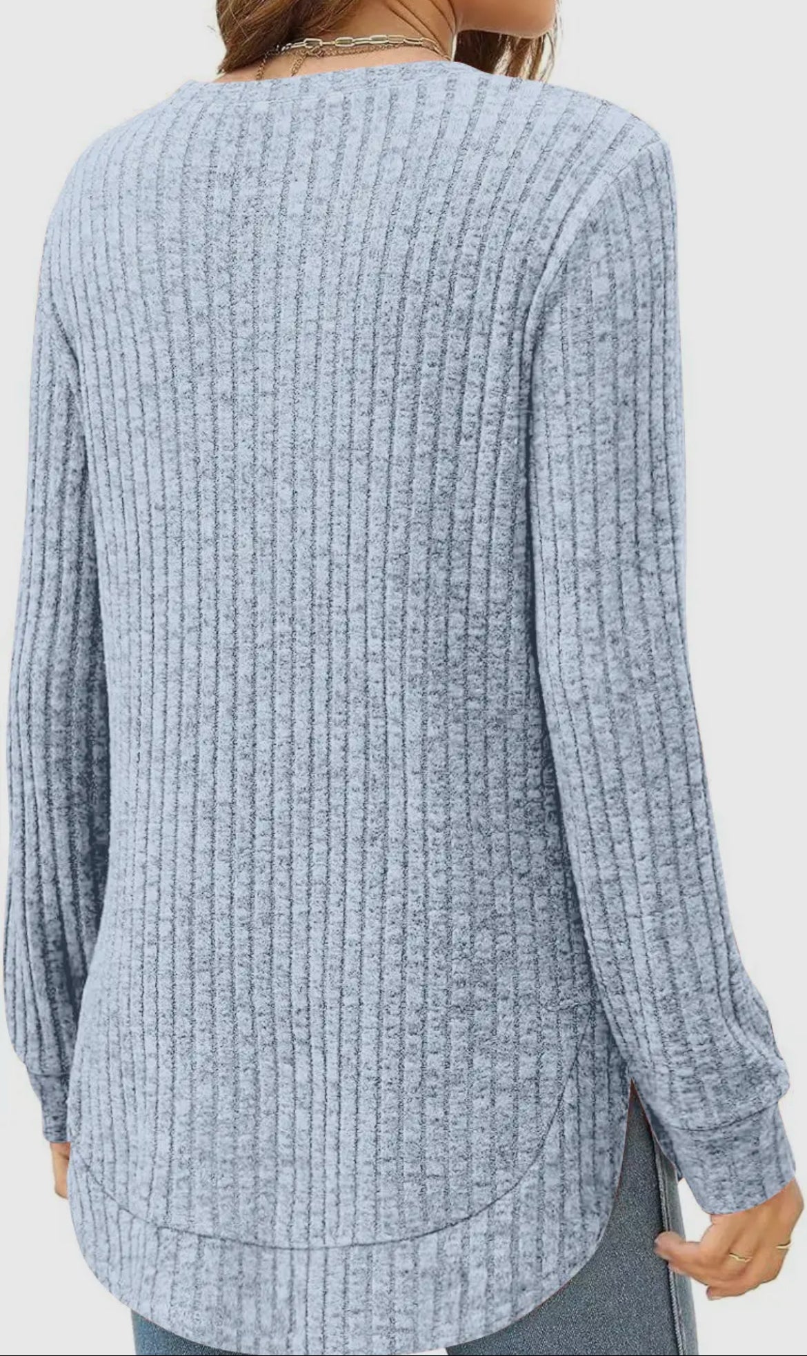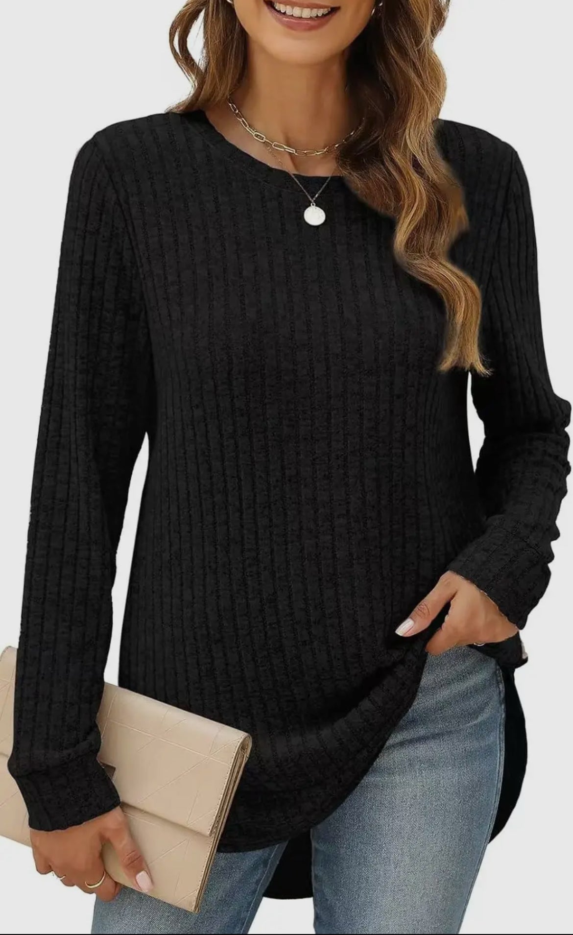 Light weight crew neck pullover style top from Ninexis. The rounded shirttail hem and subtle ribbing add interest to this deceptively simple top!