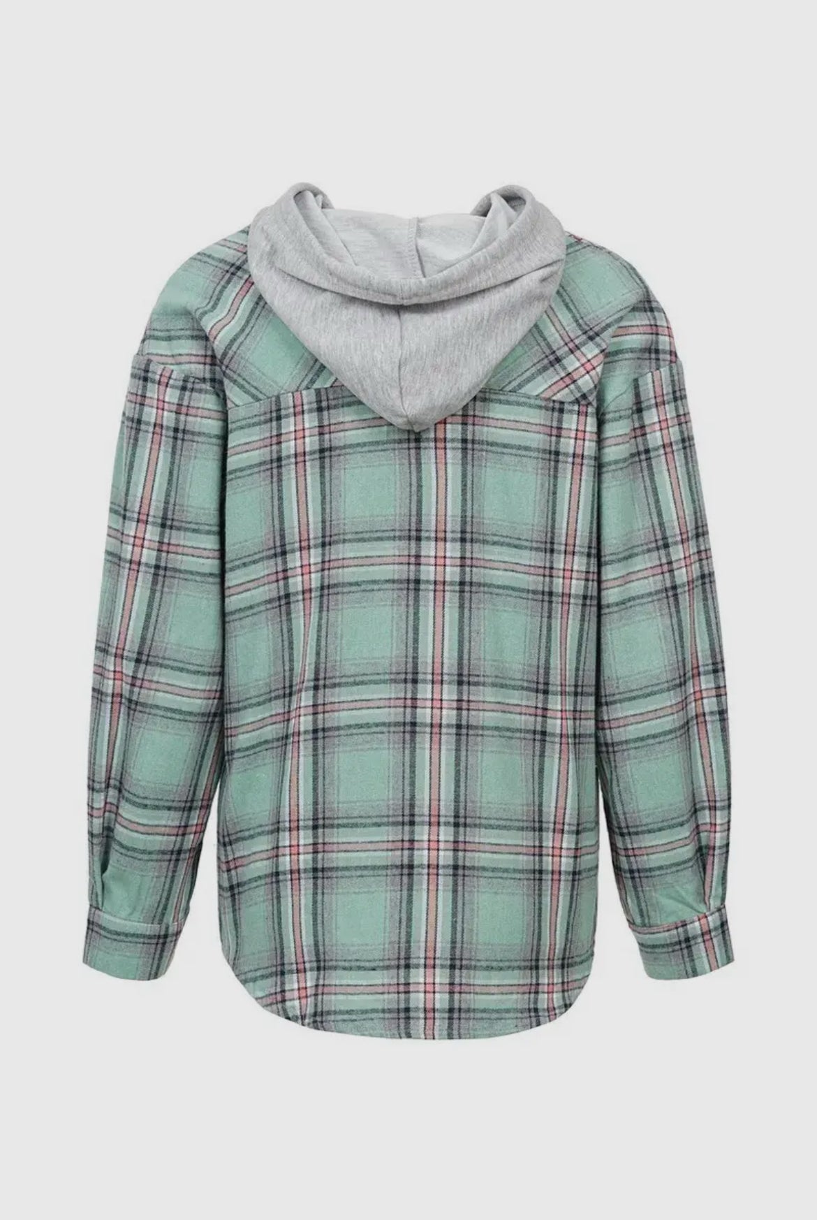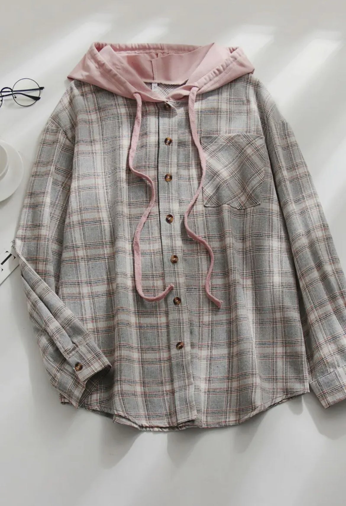 Casual and cute, these lightweight hooded shirt jackets are the perfect layering piece for spring and on through summer! Plaid button down shirt with solid color hood.