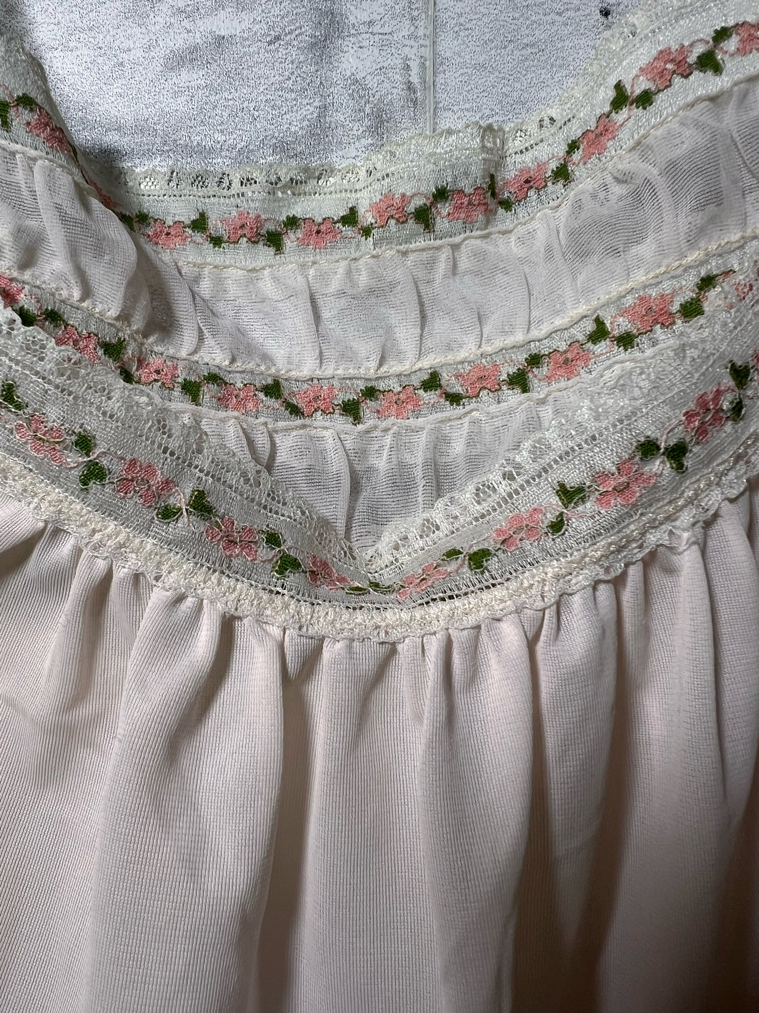 Vintage nylon slip in light pink with pink and green floral lace trim. So sweet! Measures approx 38" long from shoulder, 19" flat from armpit to armpit (38" bust)