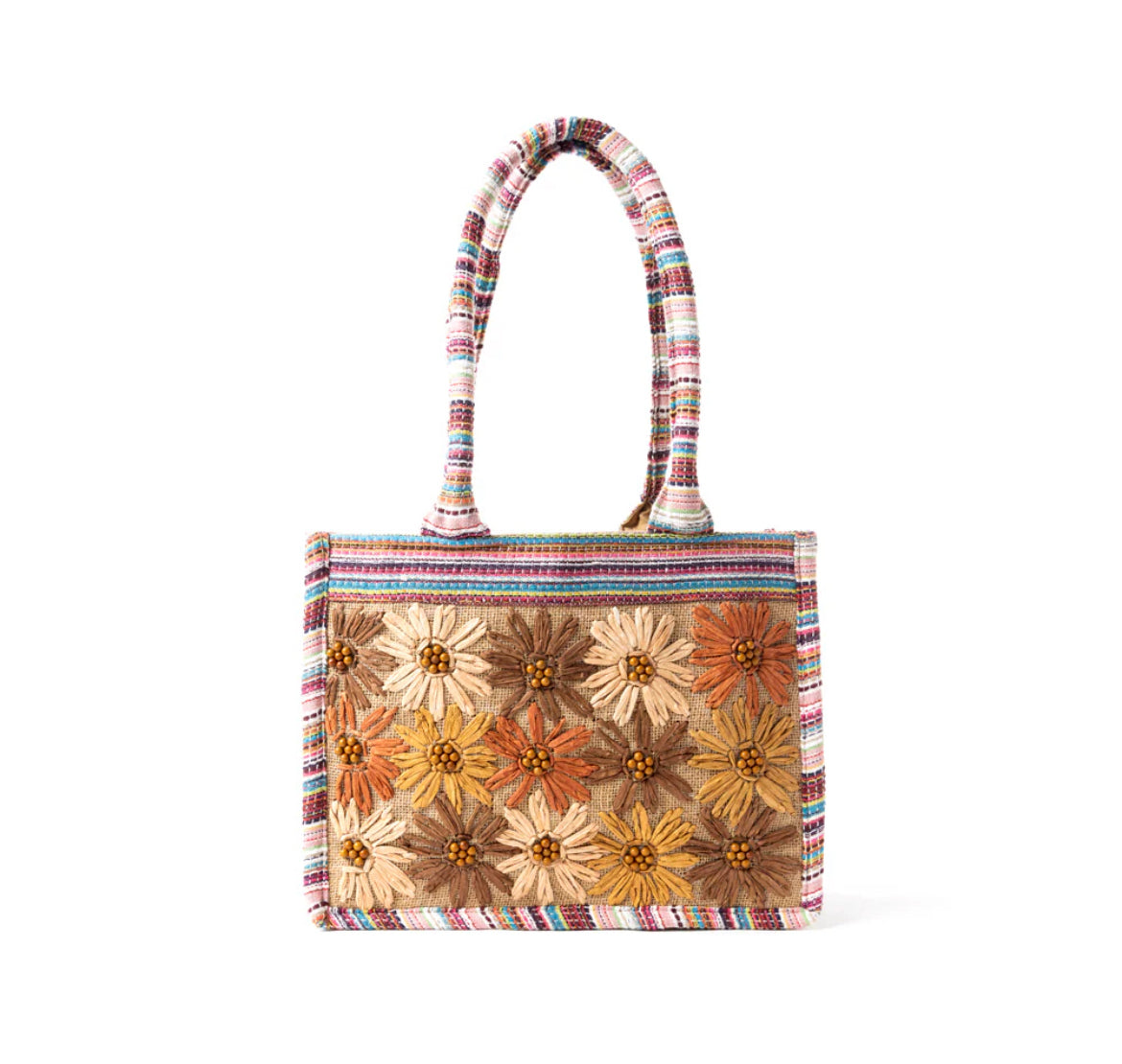 Add boho charm to your look with this hand-embroidered sunflower tote. Featuring vibrant stripes and earthy tones, it's both stylish and practical—perfect for festivals or market days. Made of rug & canvas. Dry clean only.