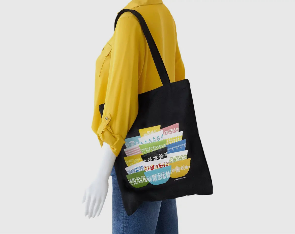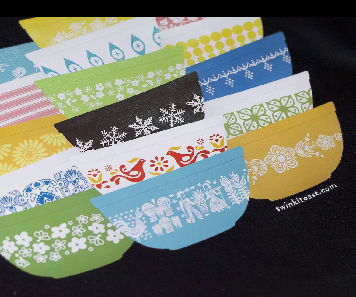 The front features a crisp, detailed print of stacked Pyrex mixing bowls — a cheerful nod to the mid-century designs we all know and love.