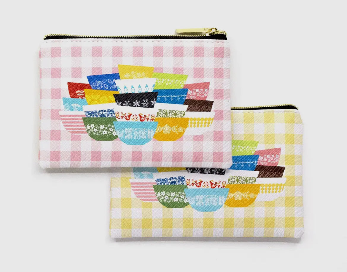 A retro-inspired zipper pouch made from vegan leather. The pattern is all your favorite Pyrex pieces! Pouch measures 4x6", one side pick checks, the other yellow checks. So cute! Perfect for makeup, purse, stashing small things.