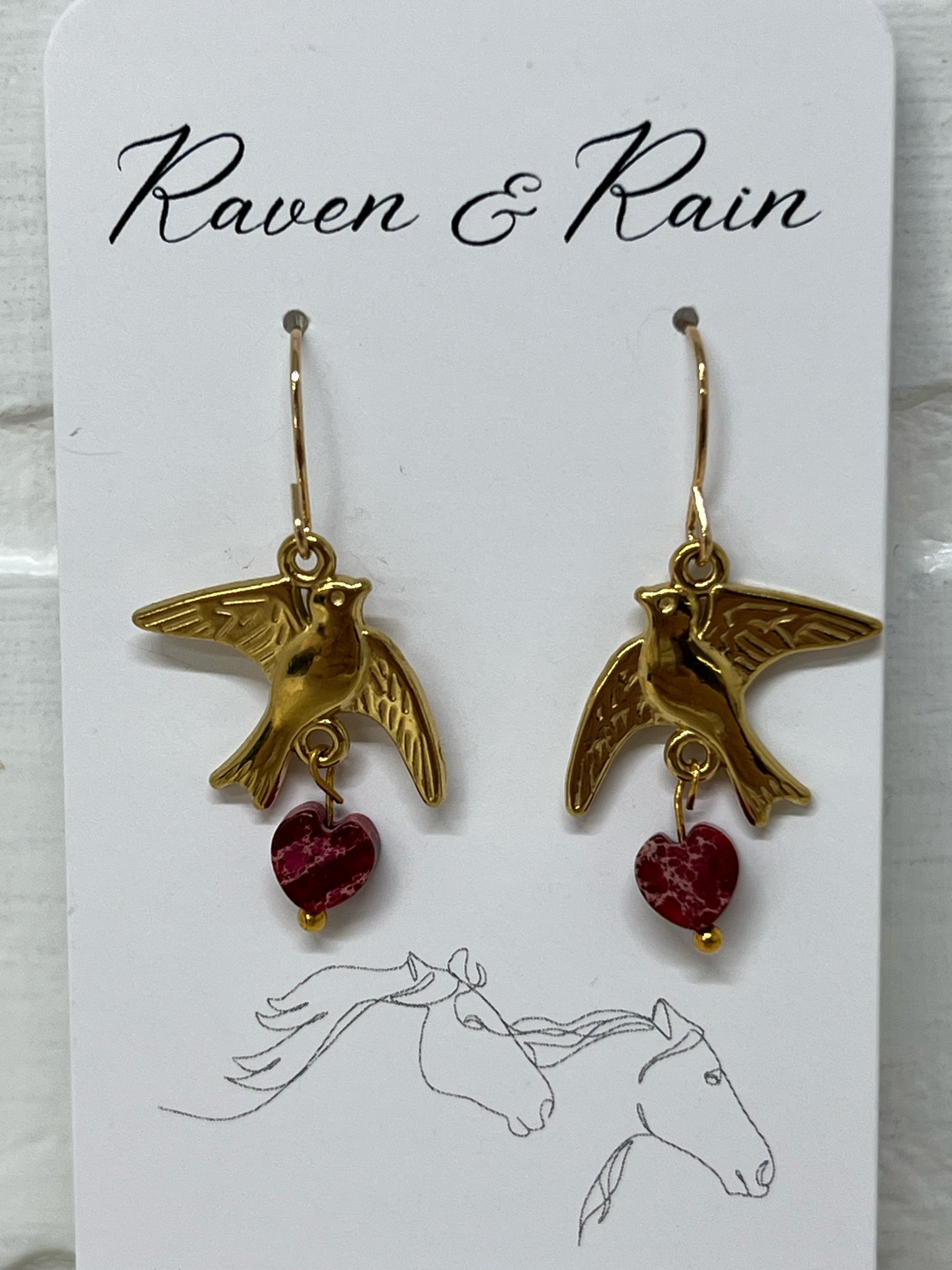Goldtone stainless steel bird charms with a red heart shaped bead. These lightweight earrings are made with 14K gold plated ear wires.