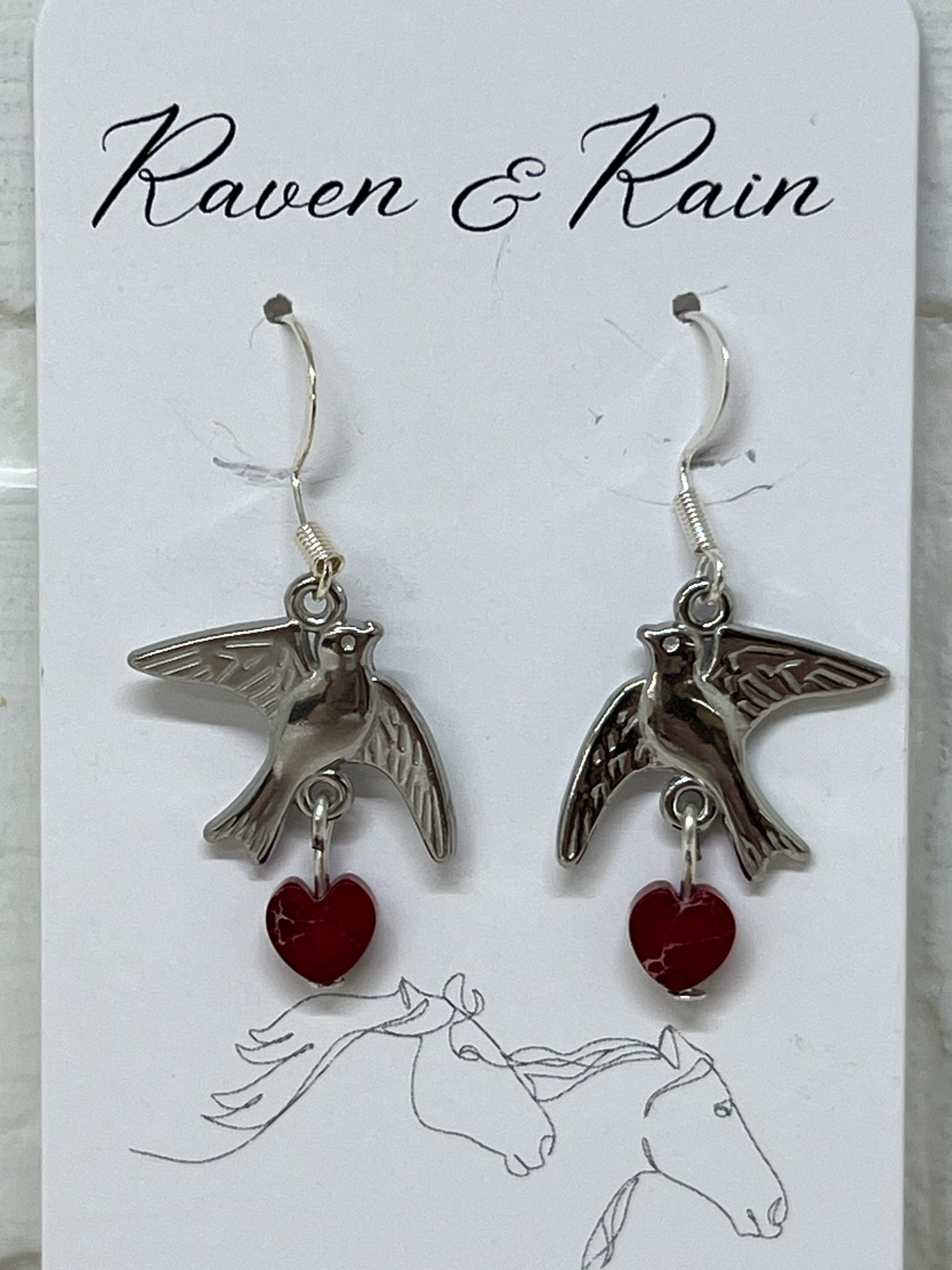 Silvertone stainless steel bird charms with a red heart shaped bead. These lightweight earrings are made with silver plated plated ear wires.