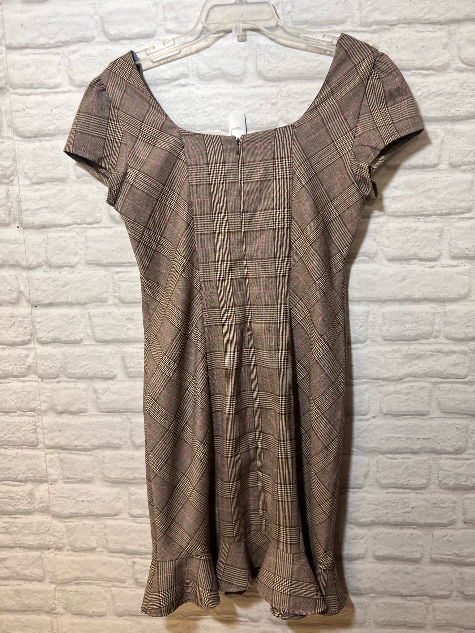Pretty light brown, pink & white plaid dress from Maurice's. Bodice is lined. Wide neckline, cap sleeves. Cute frill at hemline.