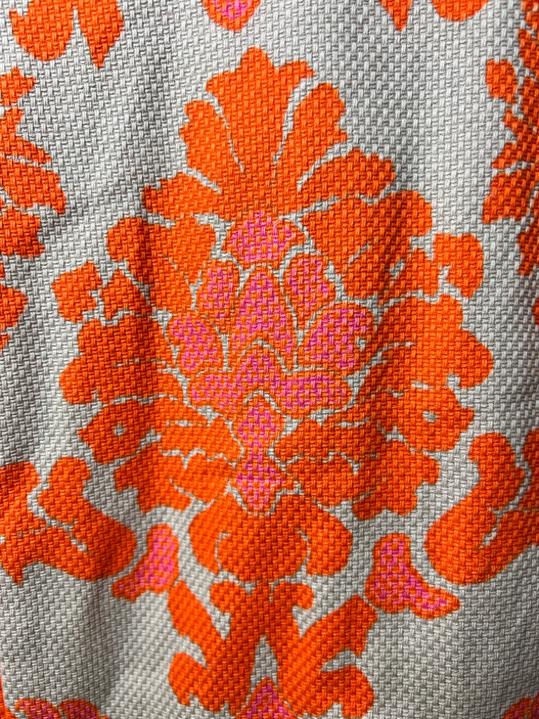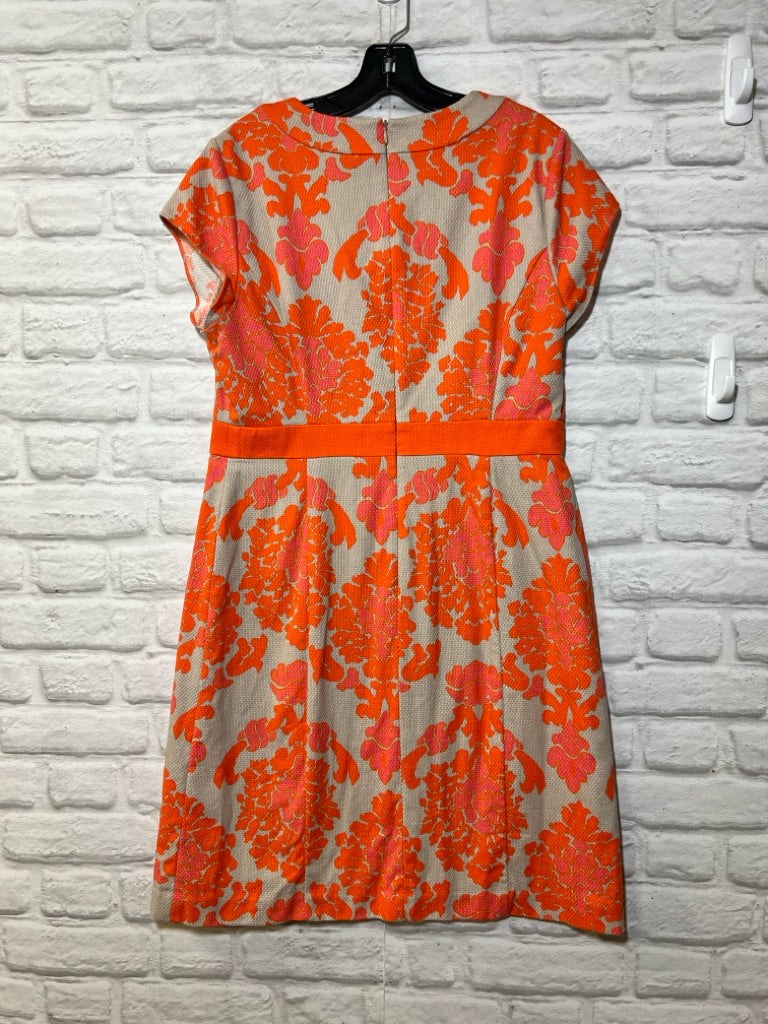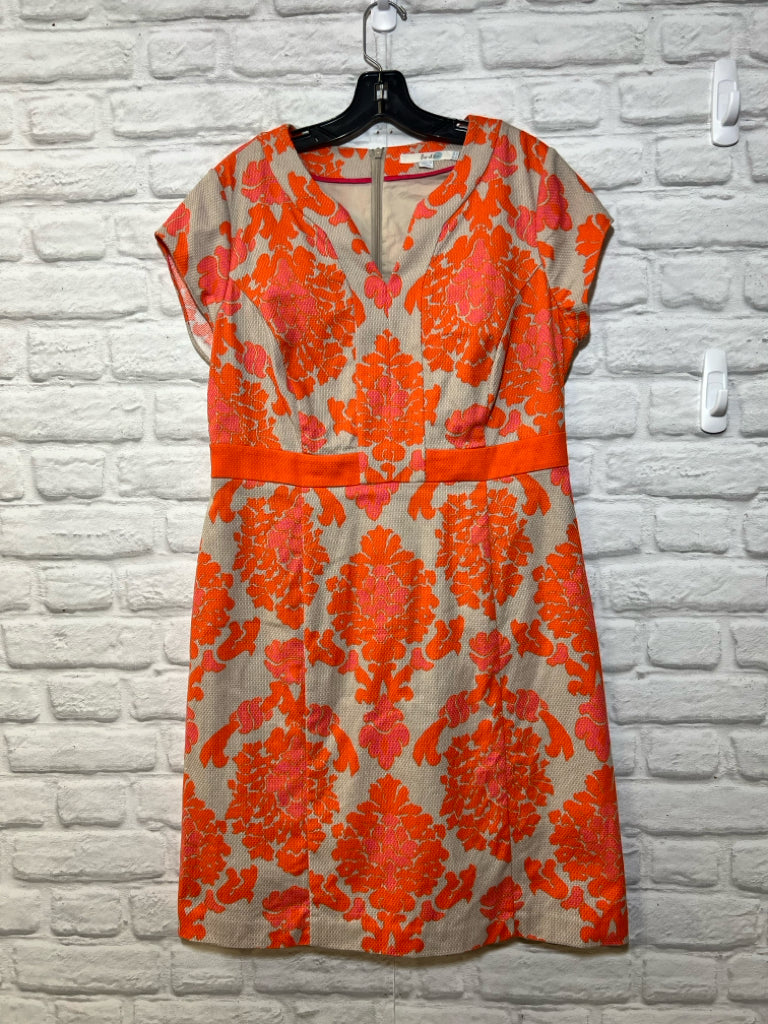 100% cotton dress from Boden, features a textured outer later with a pink & orange floral pattern on a tan background. The dress is lined w/ tan fabric. Short sleeves, short hemline, zipper back, notched neckline in front.