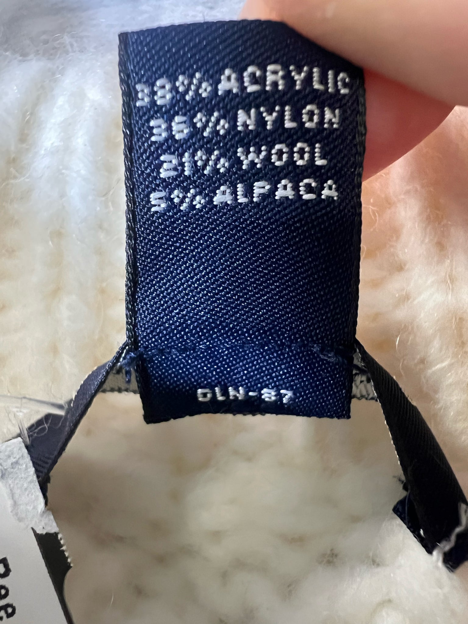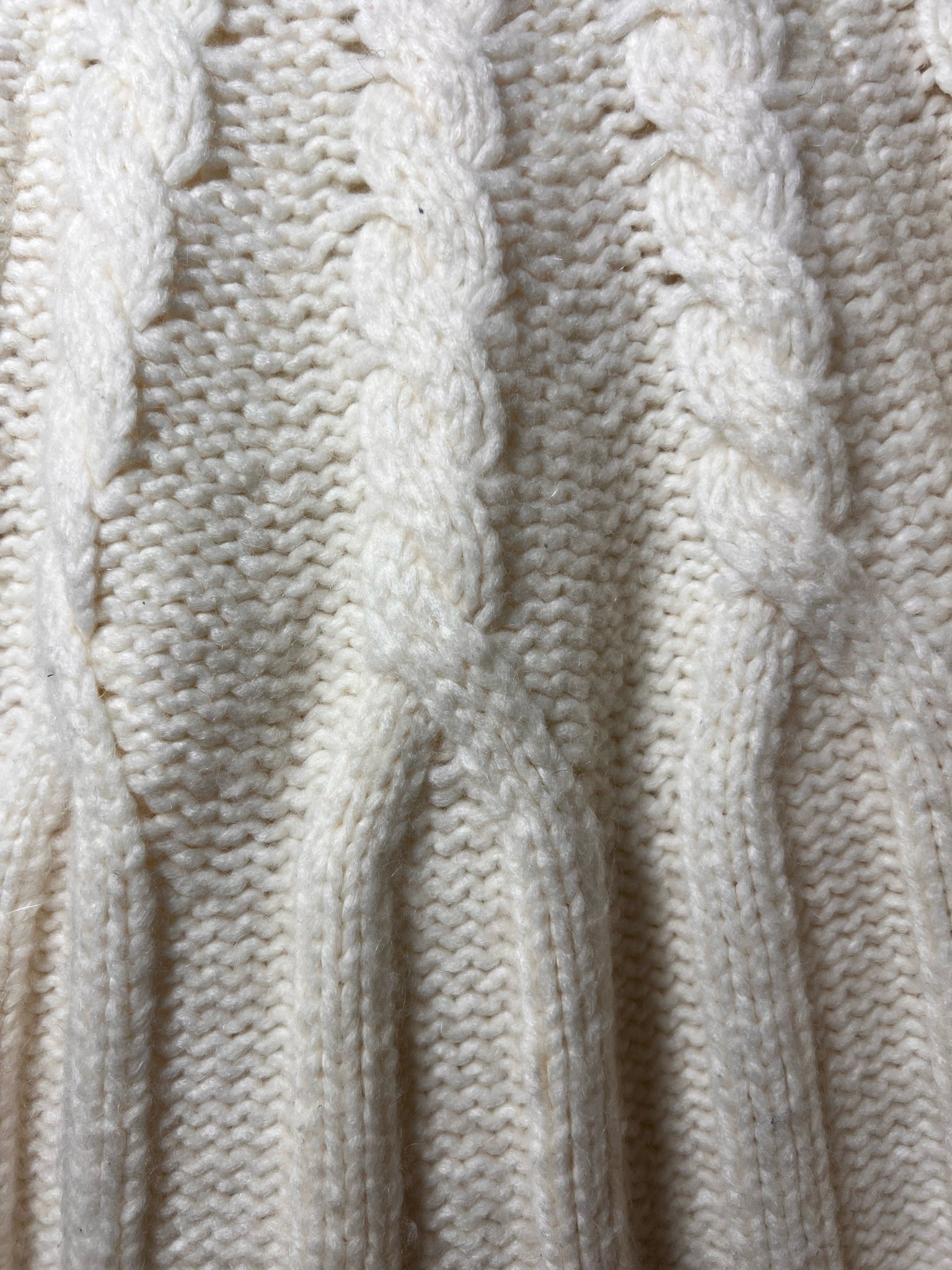 Size 20W-22W/2x cable knit sweater in a very soft blended fabric containing acrylic/nylon/wool & alpaca. Cable knit front, drop style sweater w/ half length wide sleeves. Fabric is very soft in a creamy white color.