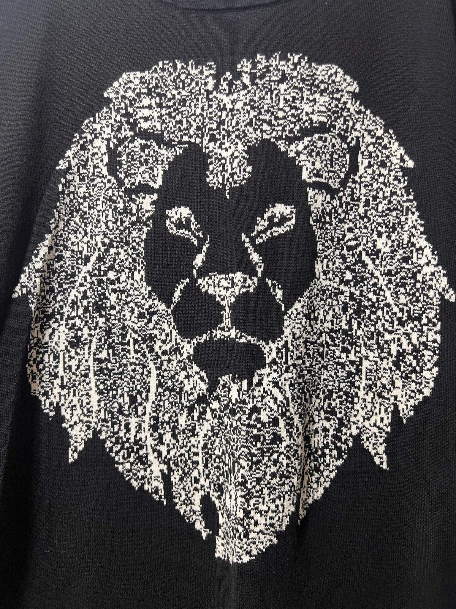 Black cotton sweater from CAbi featuring a white lion knit design on the front, high/low hem and notched hems at the sides. Boat neck, 3/4 sleeves.