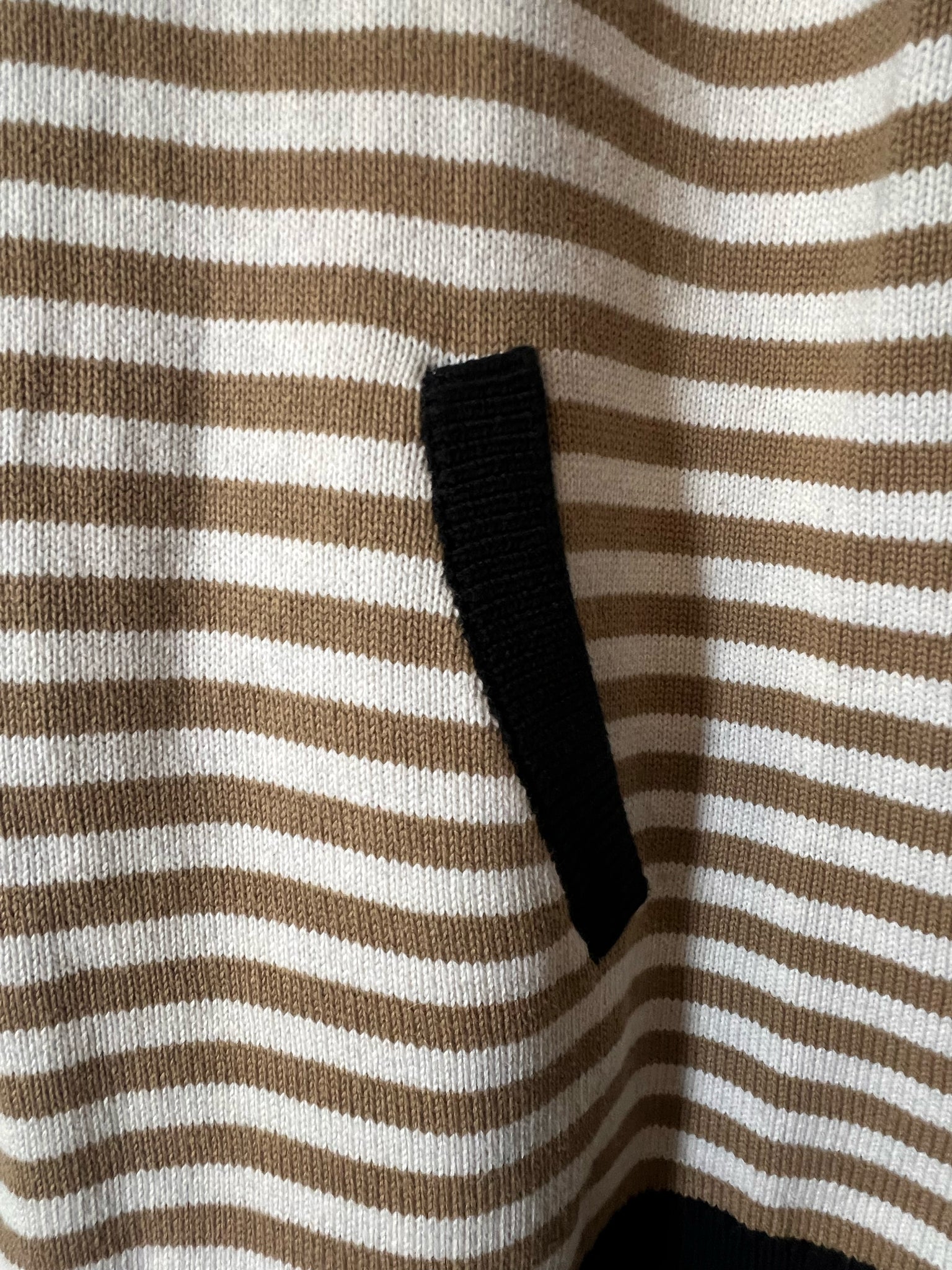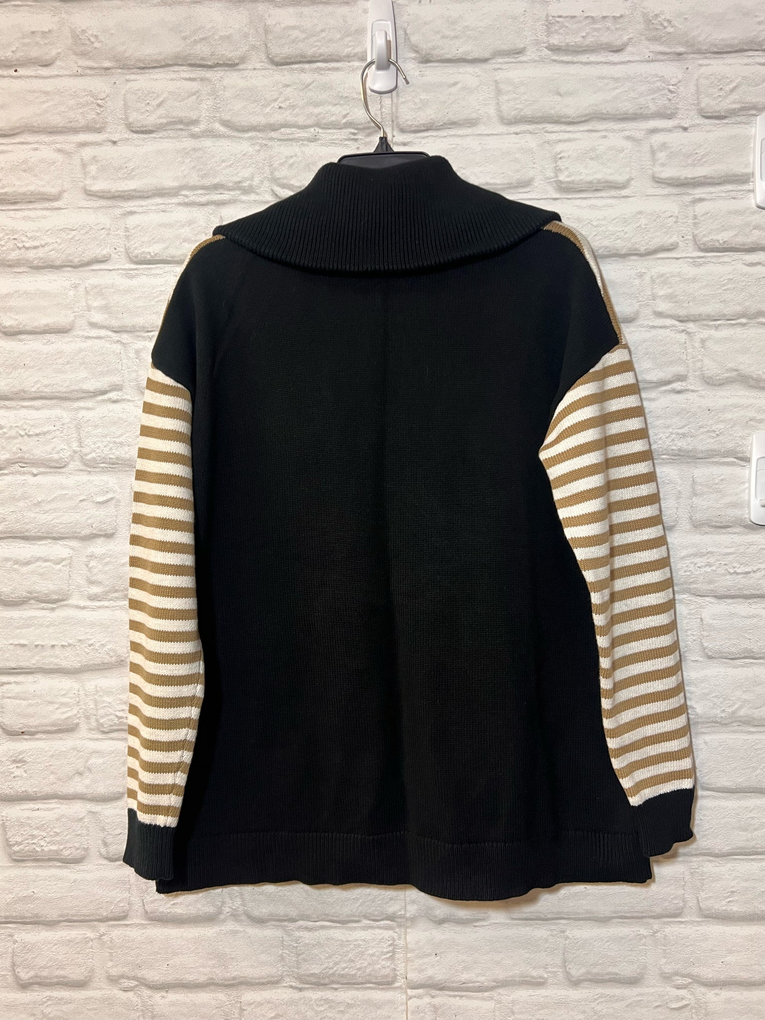 99% cotton knit cardigan with zipper front, collar. Features a white and tan striped front and solid black body.