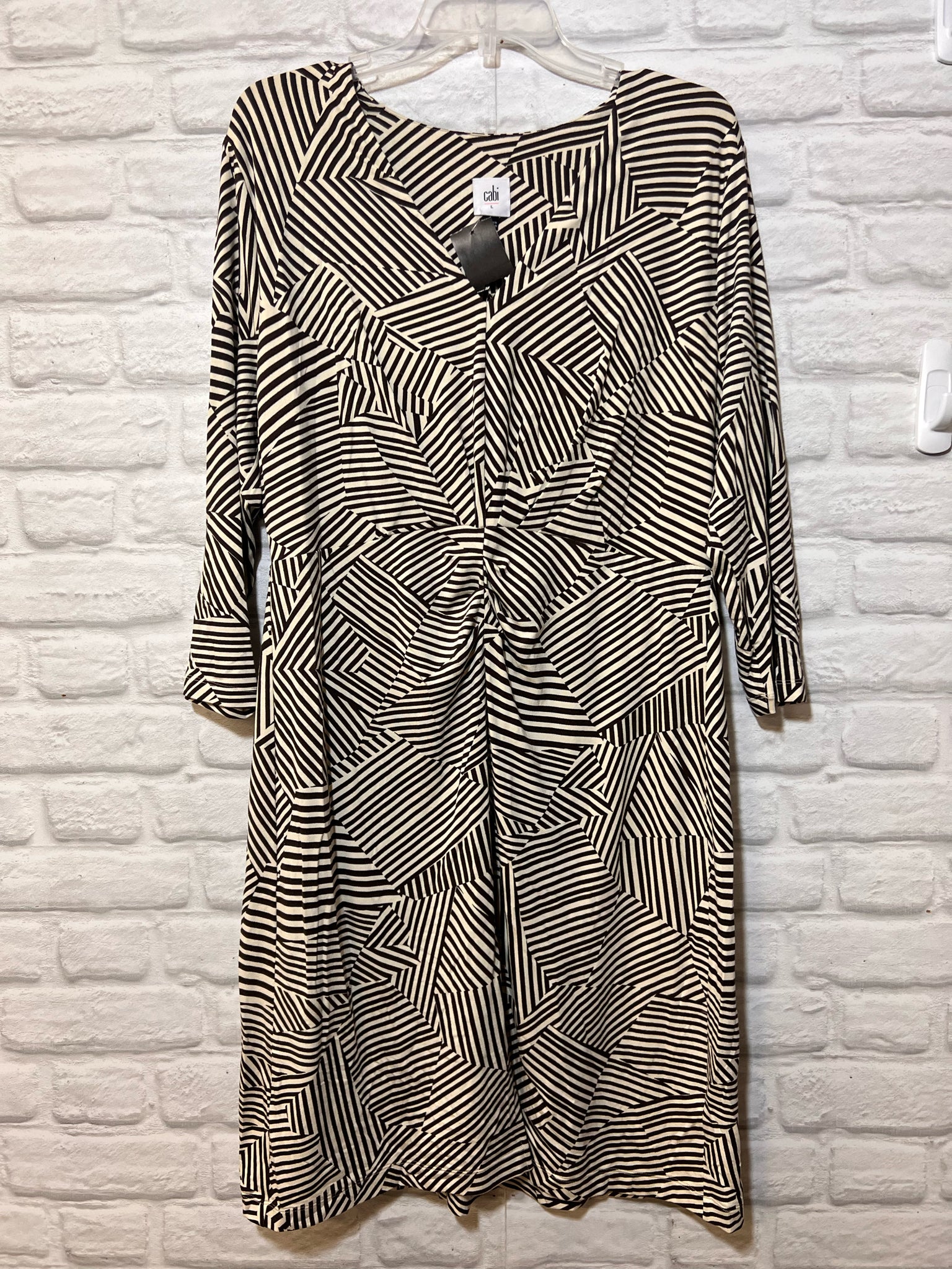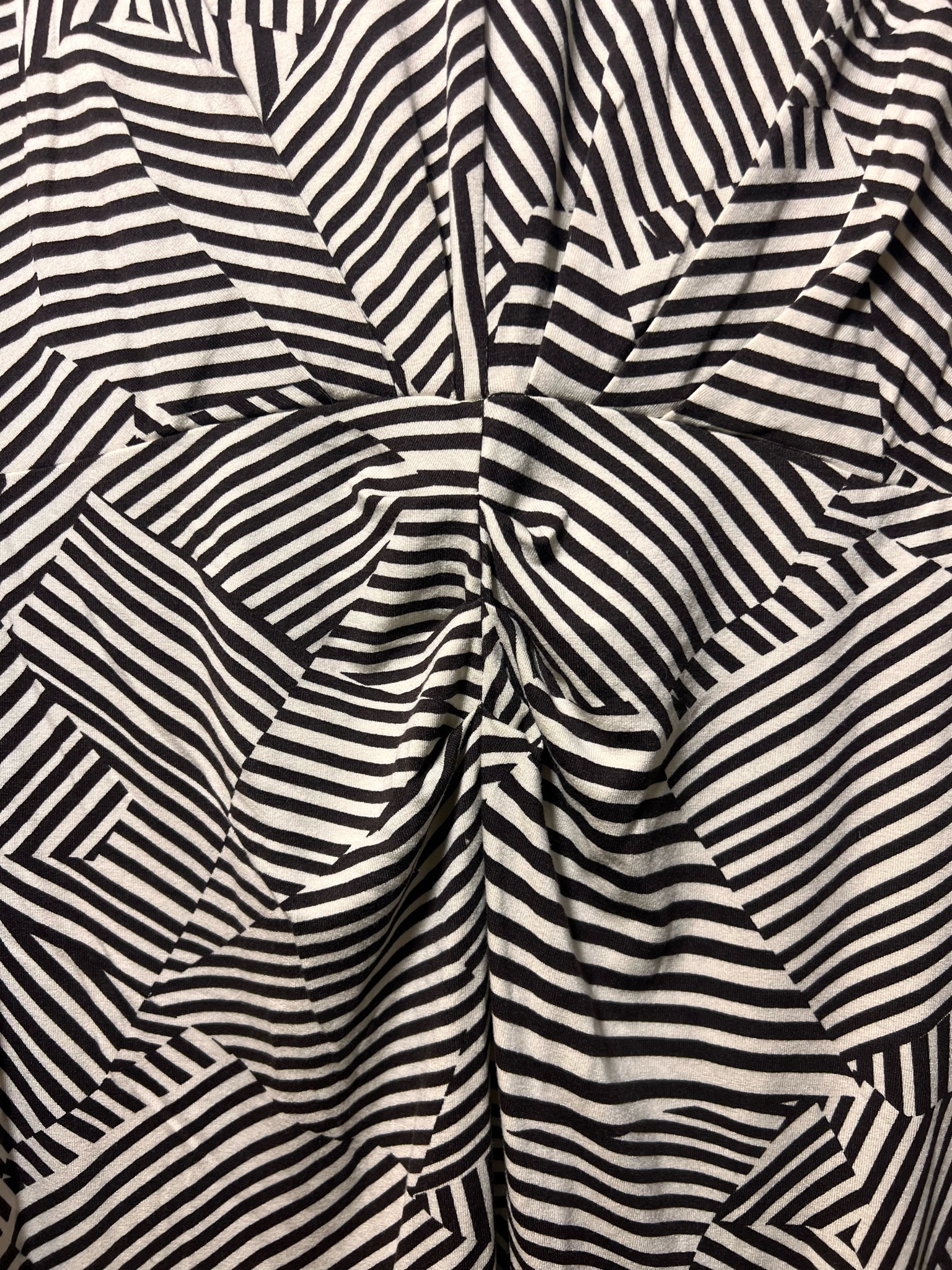V-neck dress in a flattering stretchy rayon blend fabric. Geometric stripe deisng in black and offwhite. Front ruching for a stylish fit. 3/4 length sleeves.