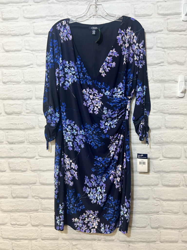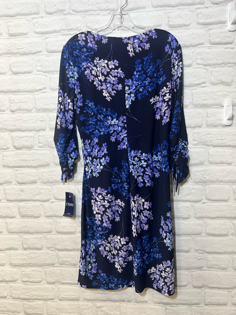 NWT navy dress with blue & purple flowers. V-neck and sleeves have ruching.