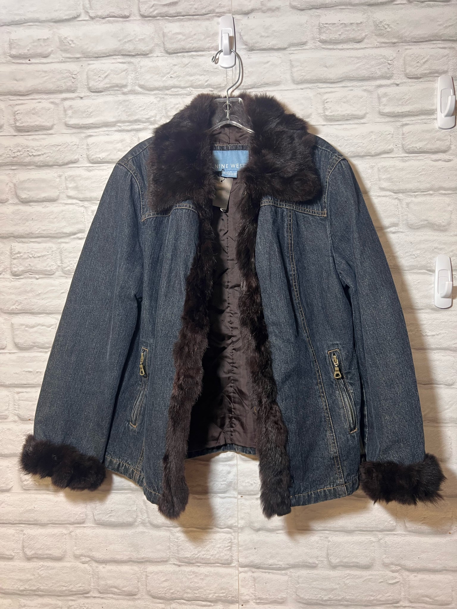 Size L Nine West Rabbit Fur Trimmed Denim Jacket w/ Quilted Lining