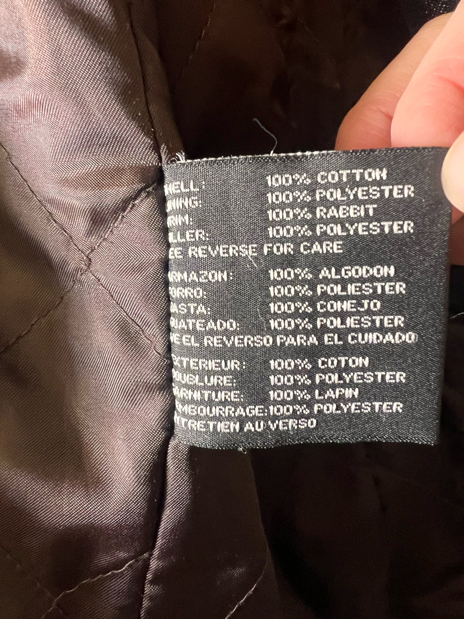 Denim jacket w/ quilted lining and rabbit fur trim. Jacket body is 100% cotton, lining 100% polyester, trim 100% rabbit fur. Zipper pockets and hook and eye closure for front of jacket. Stylish and warm!