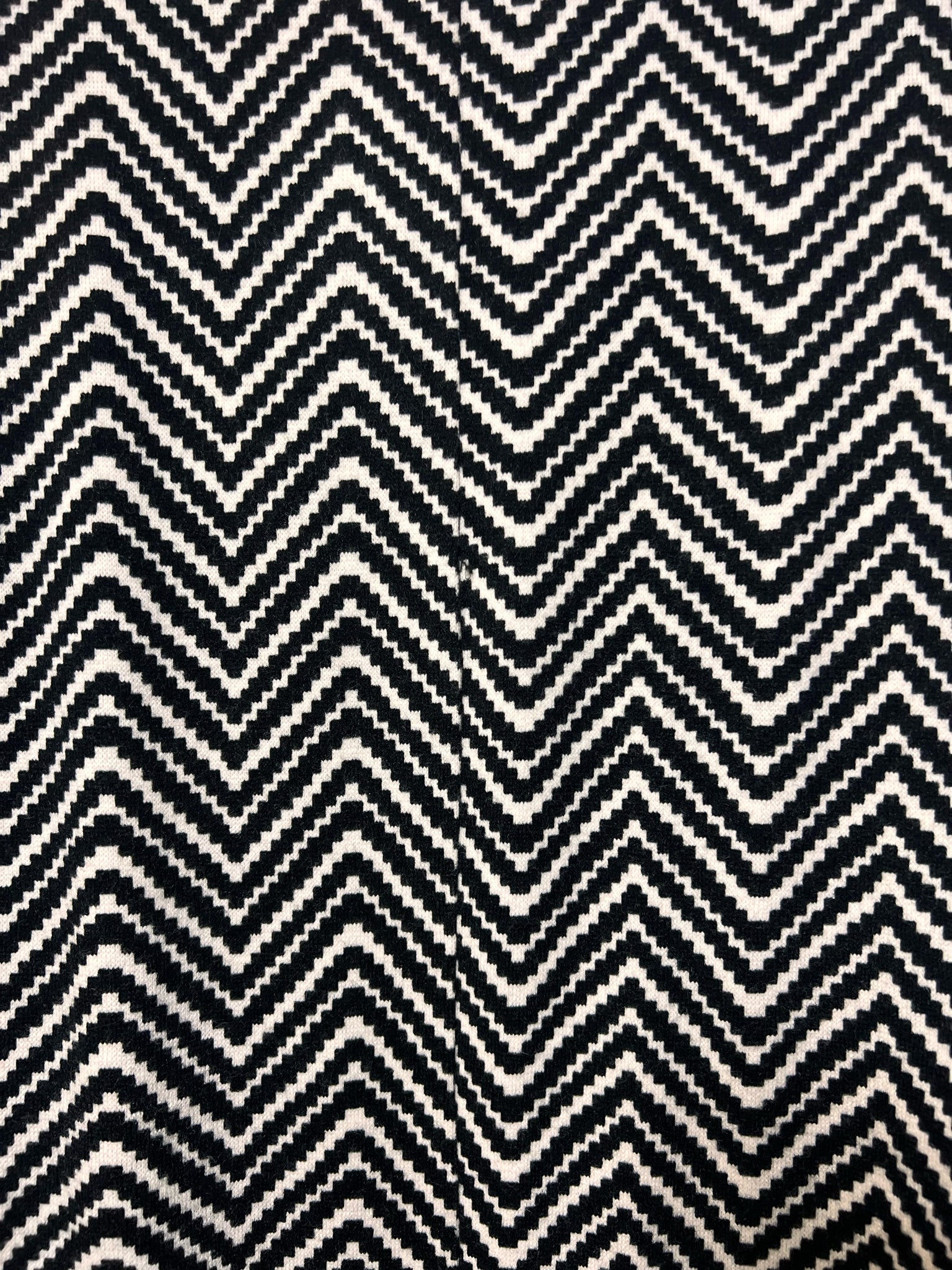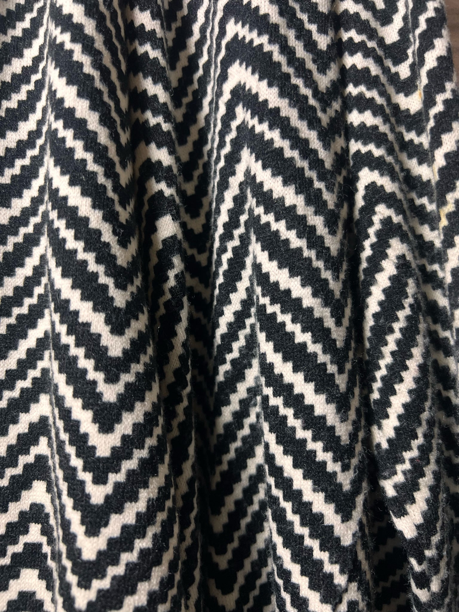 Open front cardigan with a flyaway style hem, lower in the back. Acrylic knit fabric in a fun black and white chevron pattern.