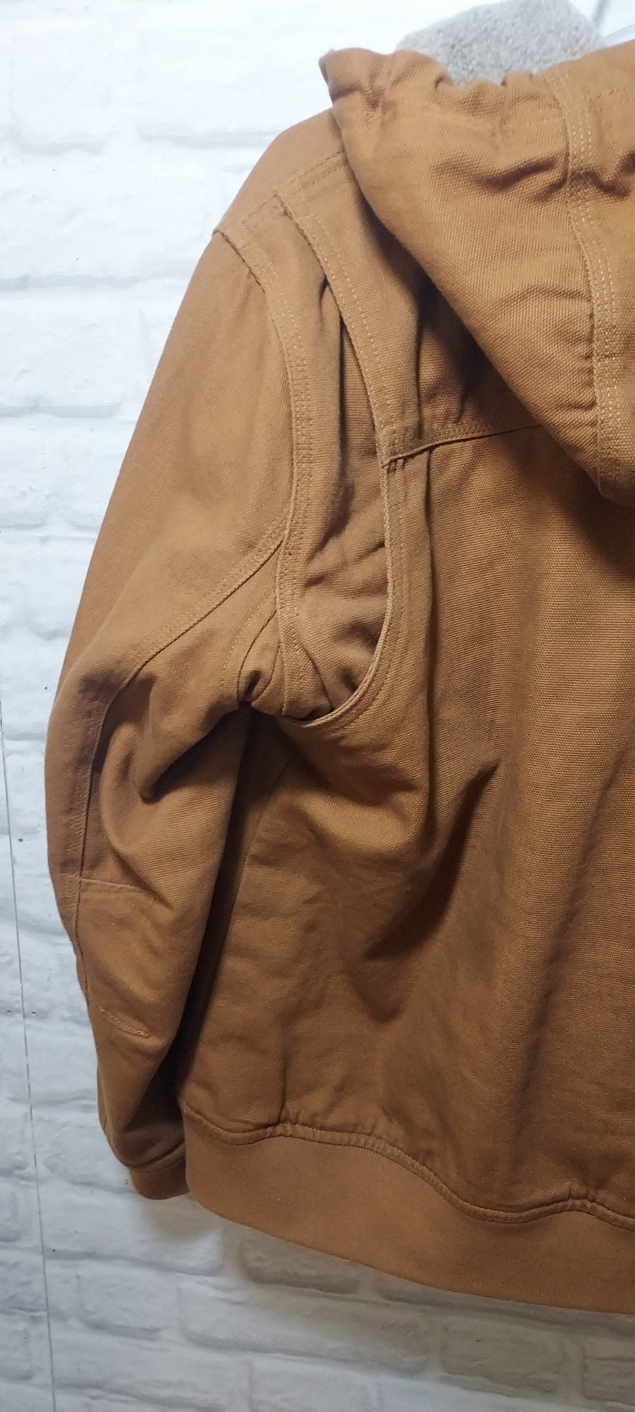 11.5 oz fire hose fabric, sherpa-lined hood and fully lined shell. Fend Off Finish fabric repels all signs of water, oil, and mystery stains. Oodles of pockets. Like new condition. Retail $189.50