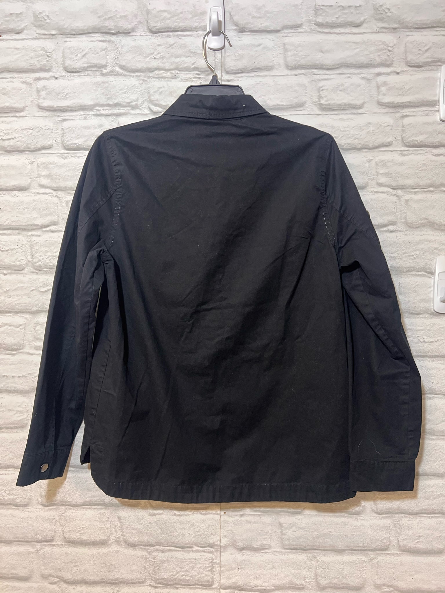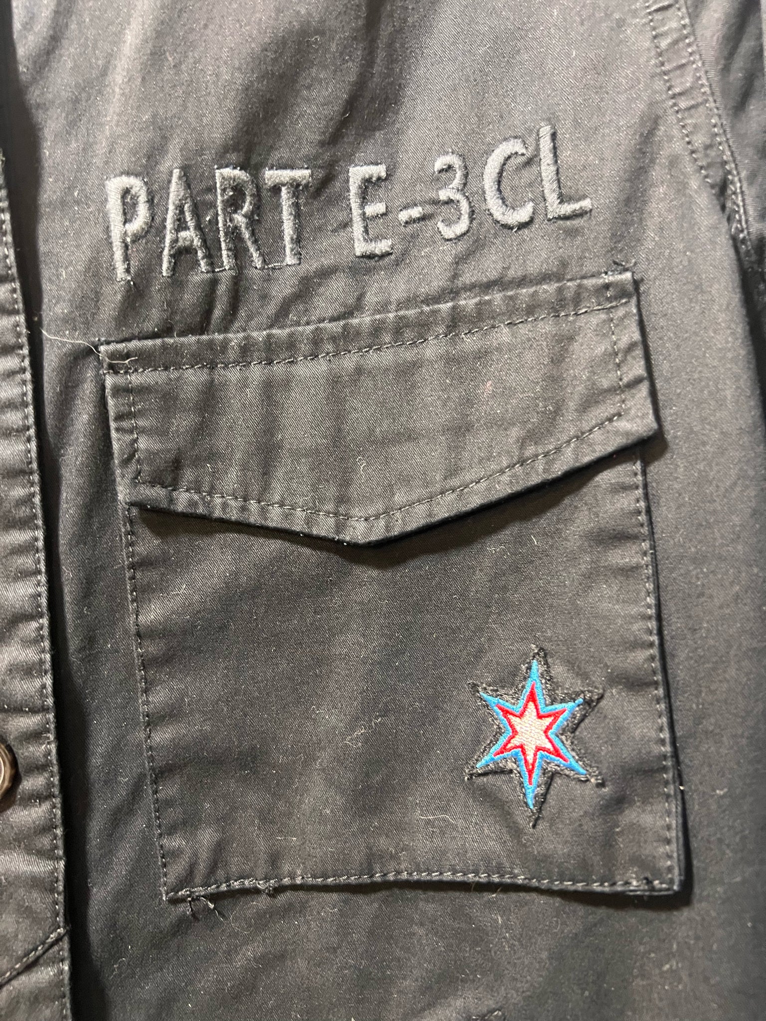 Black snap front jacket w/ military style patches.