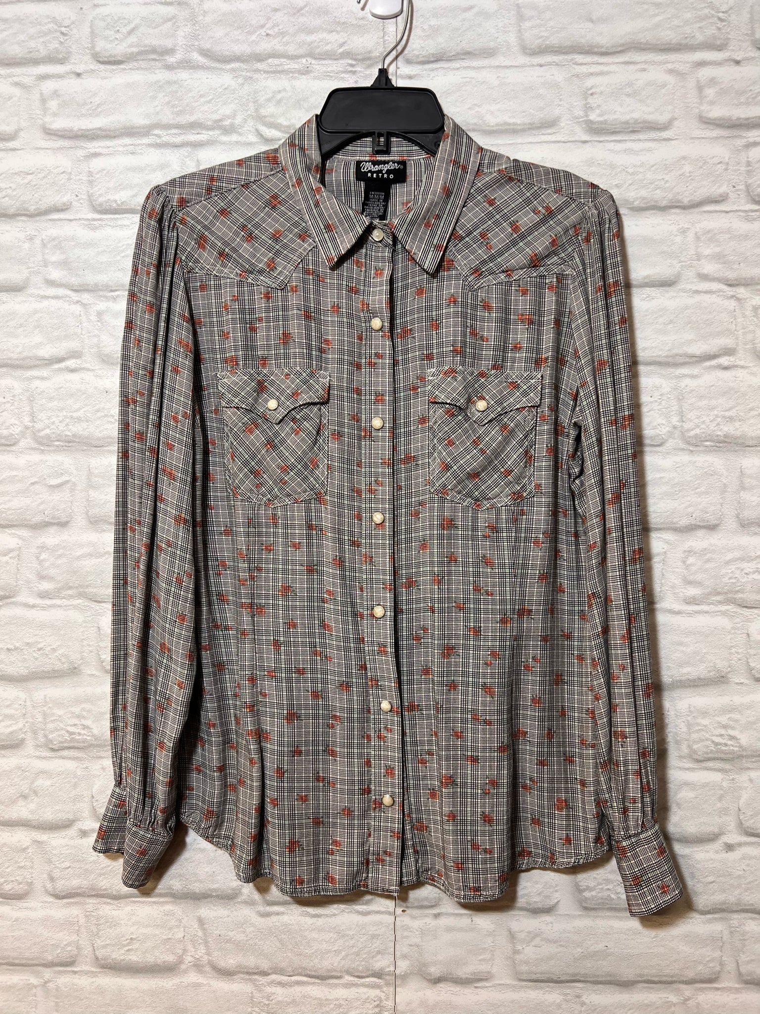 Long sleeve snap front shirt with gathering on shoulders and cuffs.