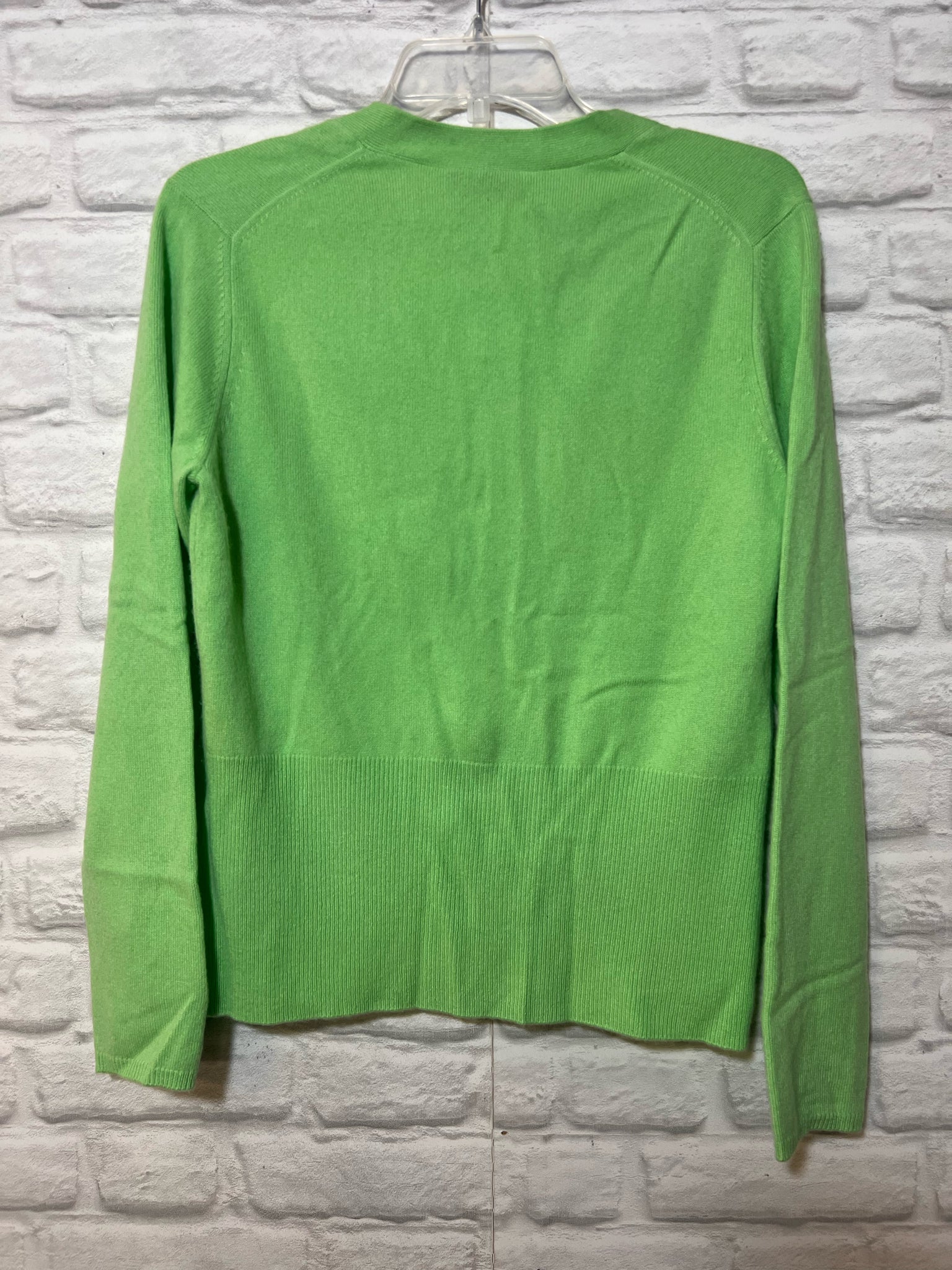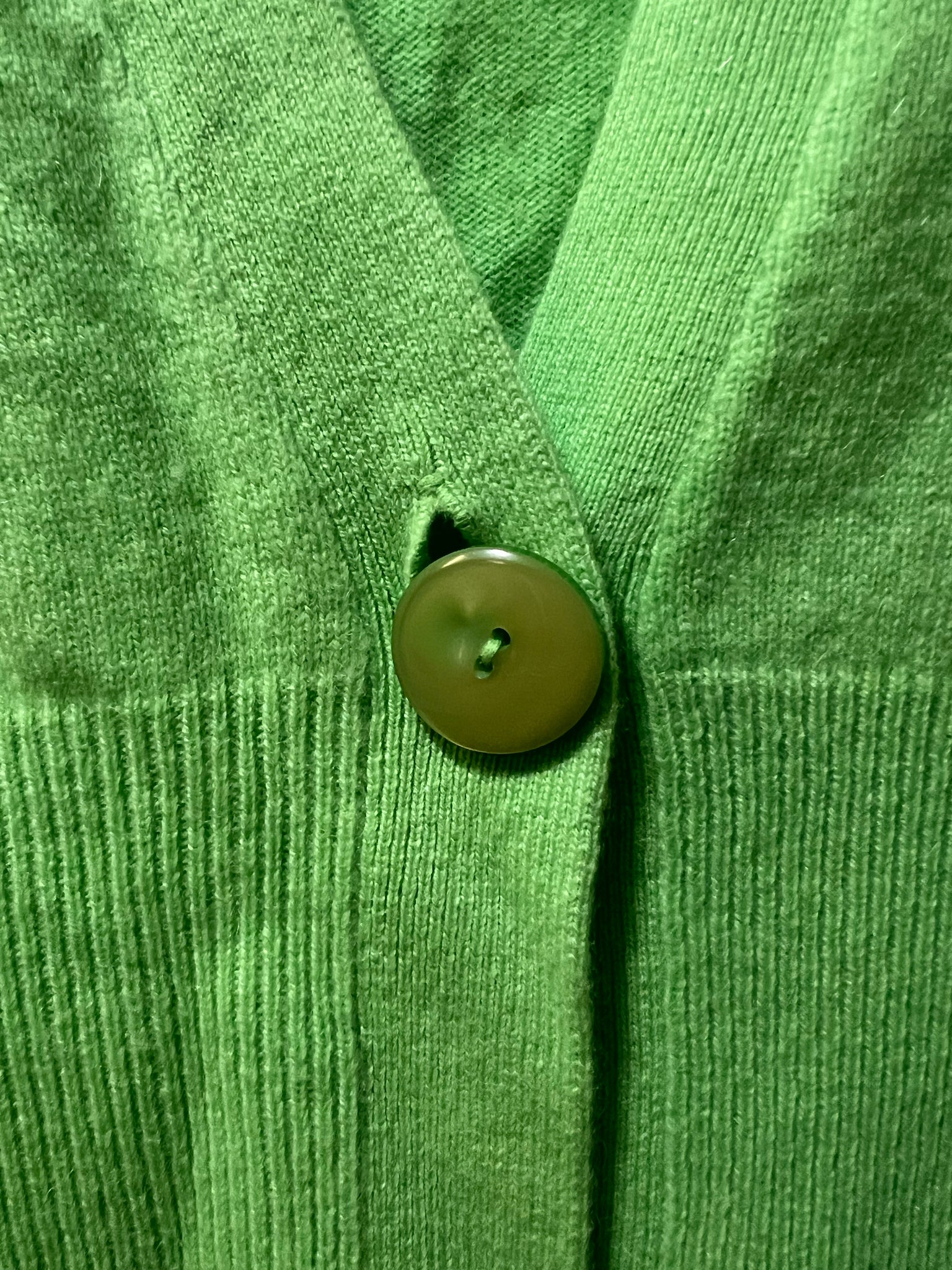 One-button cashmere cardigan in a pretty light green. Long sleeves, super soft!