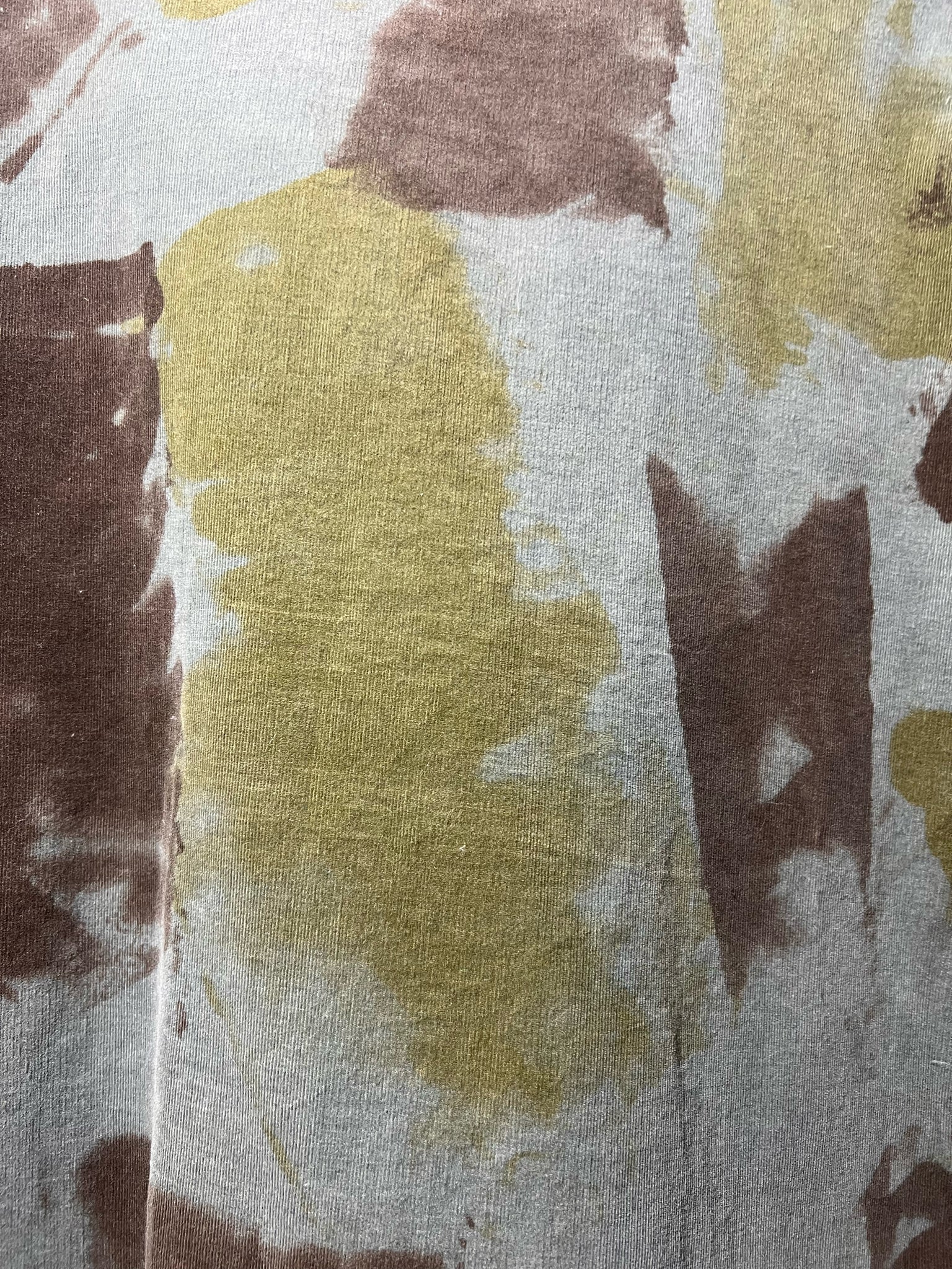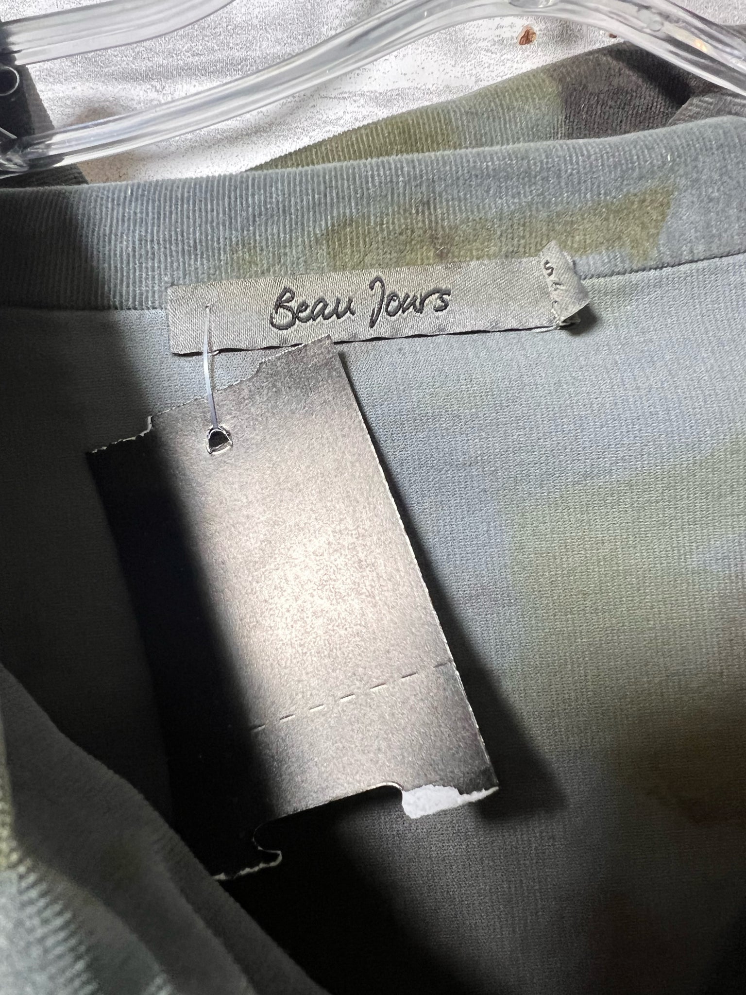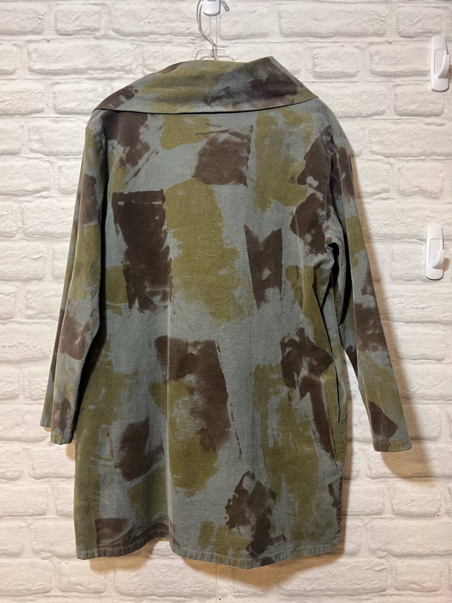 Lightly worn asymetrical zip front jacket from Beau Jours - 100% cotton, gently used. Abstract, almost camo pattern in green, brown, blue/gray.
