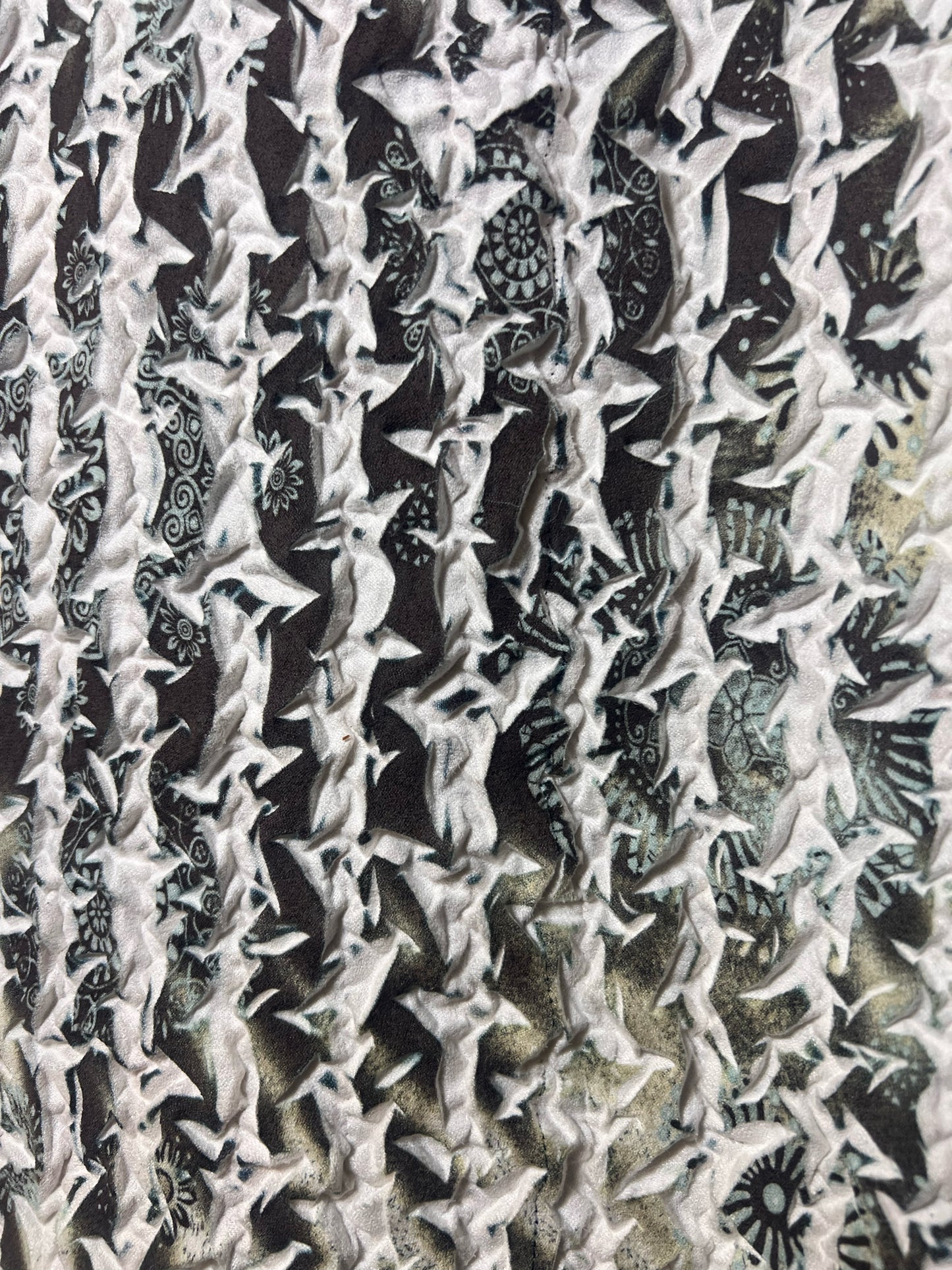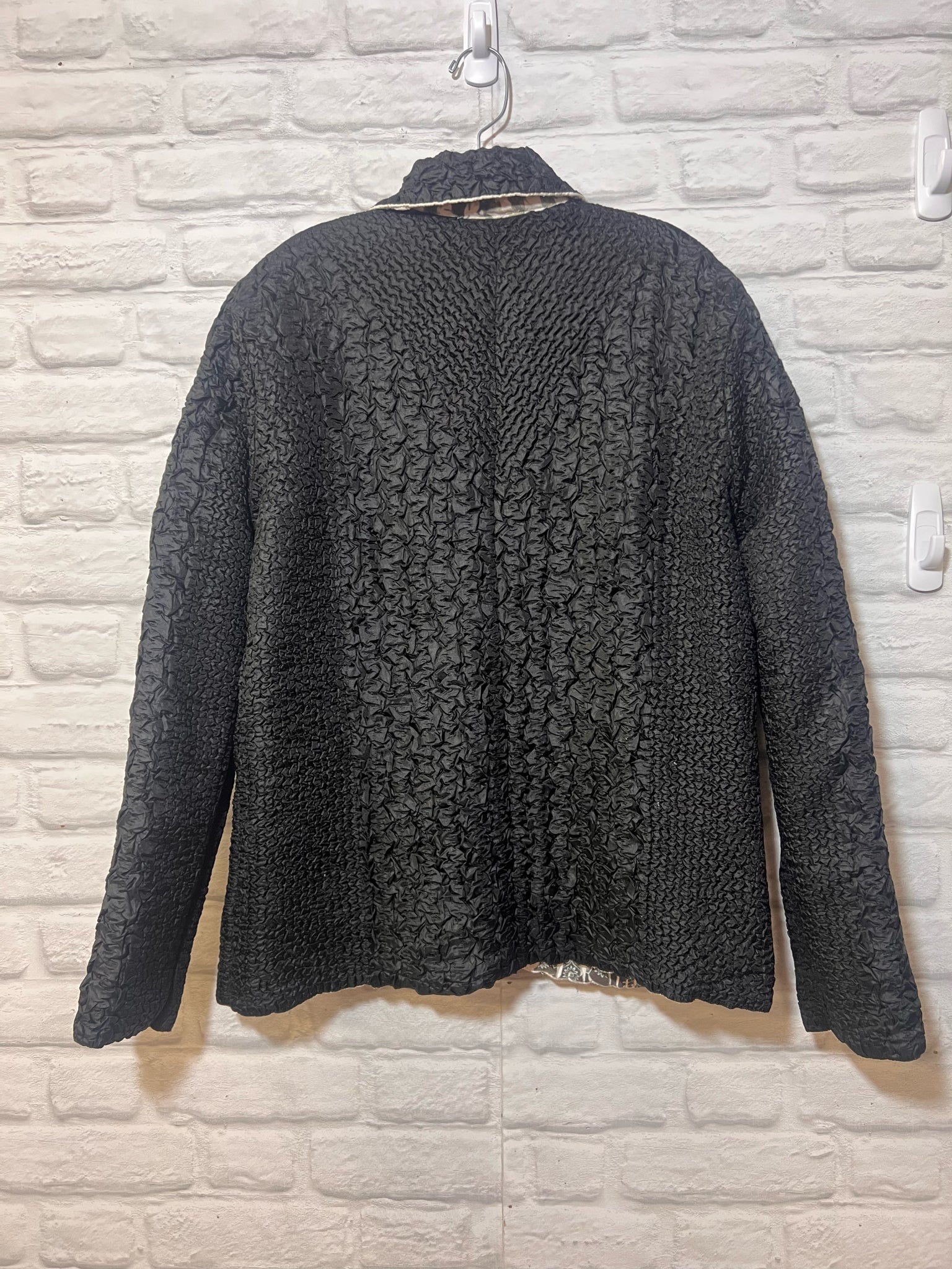 Zip up jacket in quilted polyester. One side solid black, the other multicolor greens in an abstract pattern. Fun layering piece!
