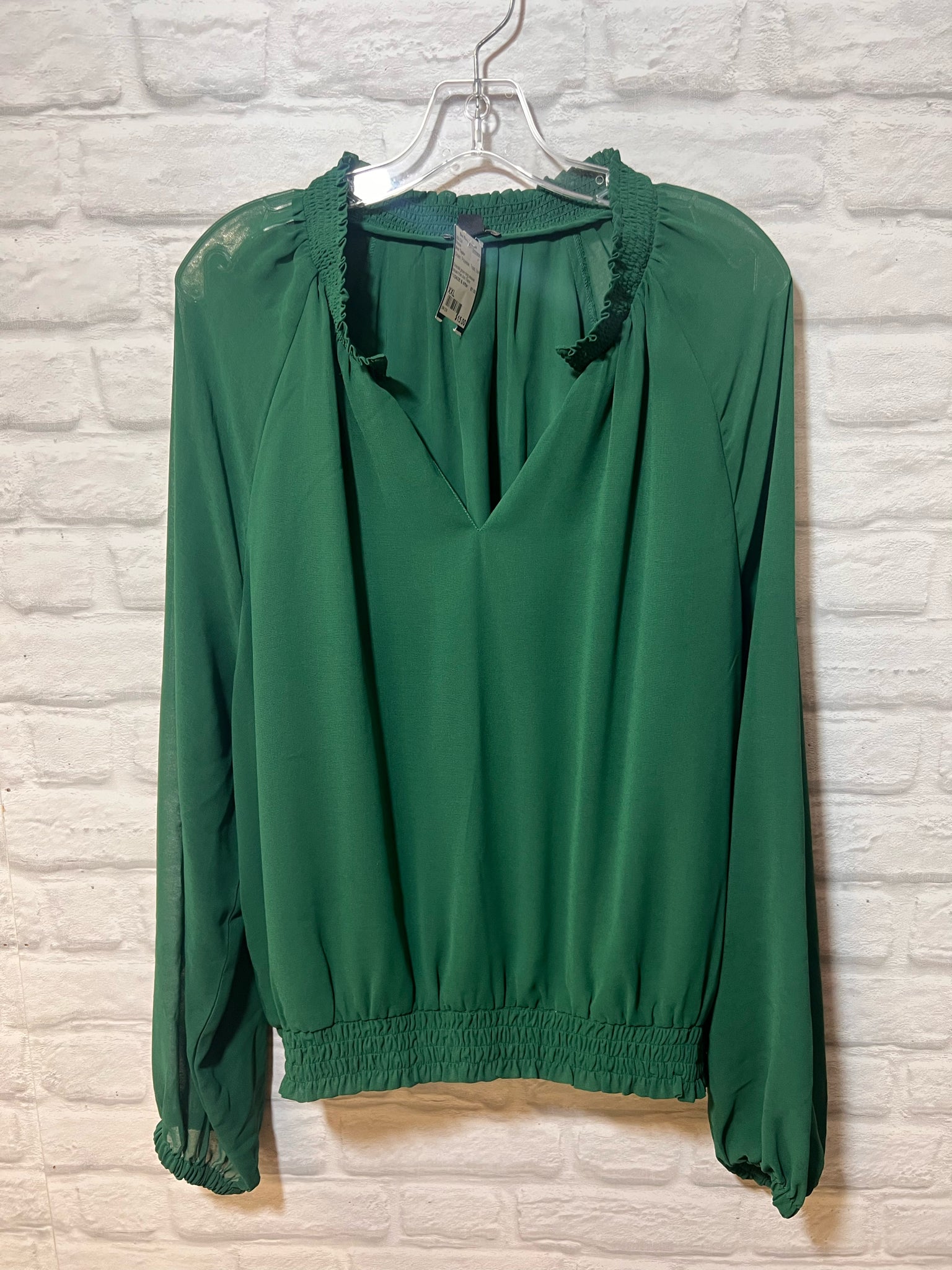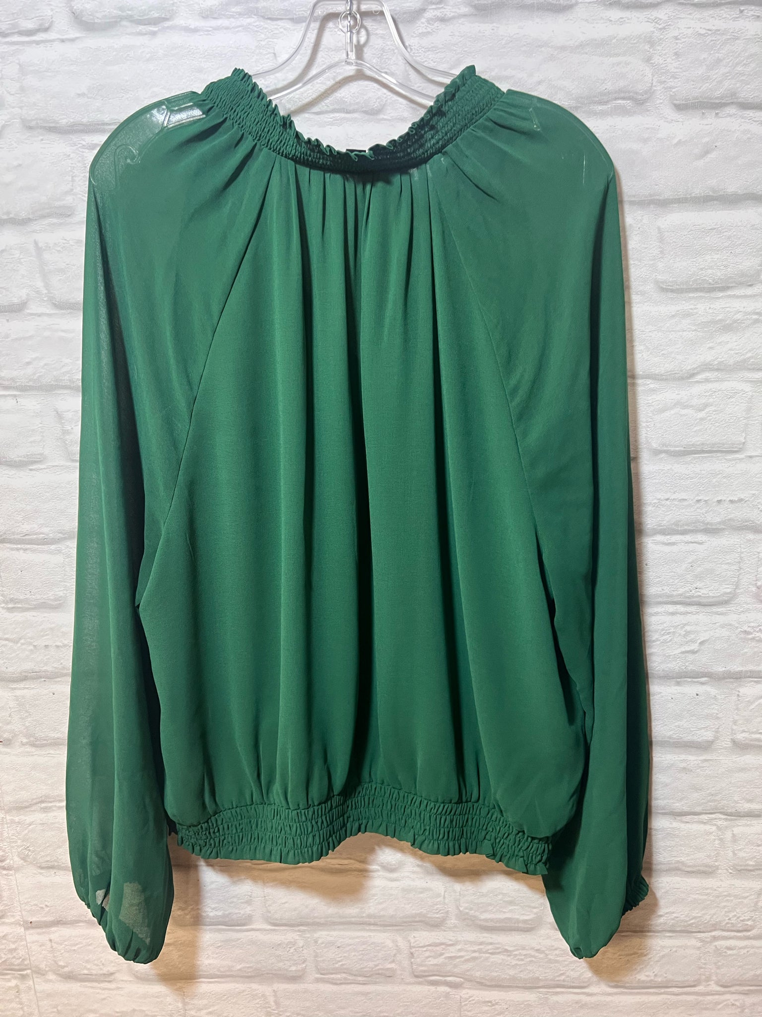 Emerald green long sleeved blouse from Ann Taylor. Elasticized cuffs, hem and neckline. Body of blouse is lined, sleeves are semi sheer